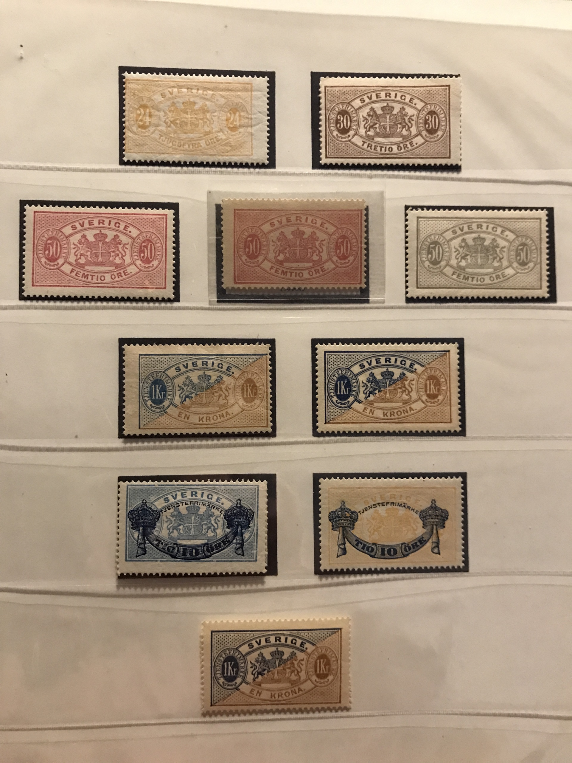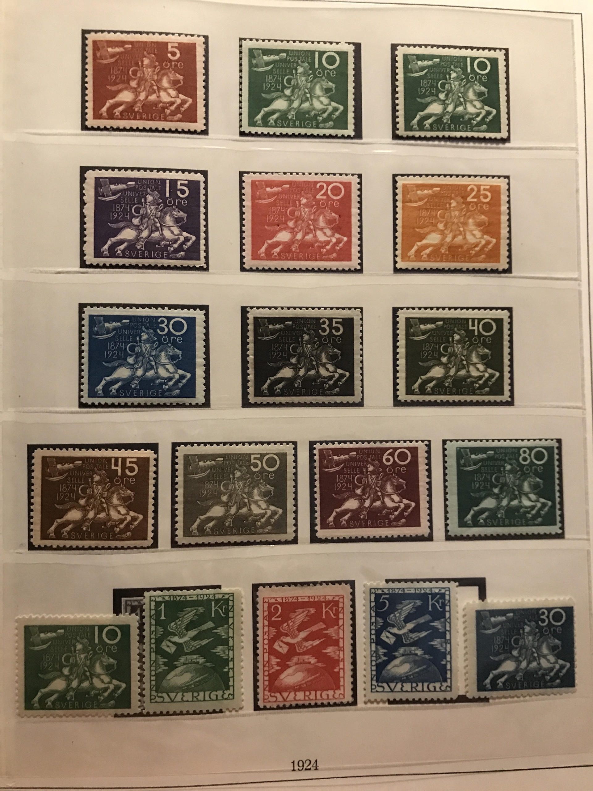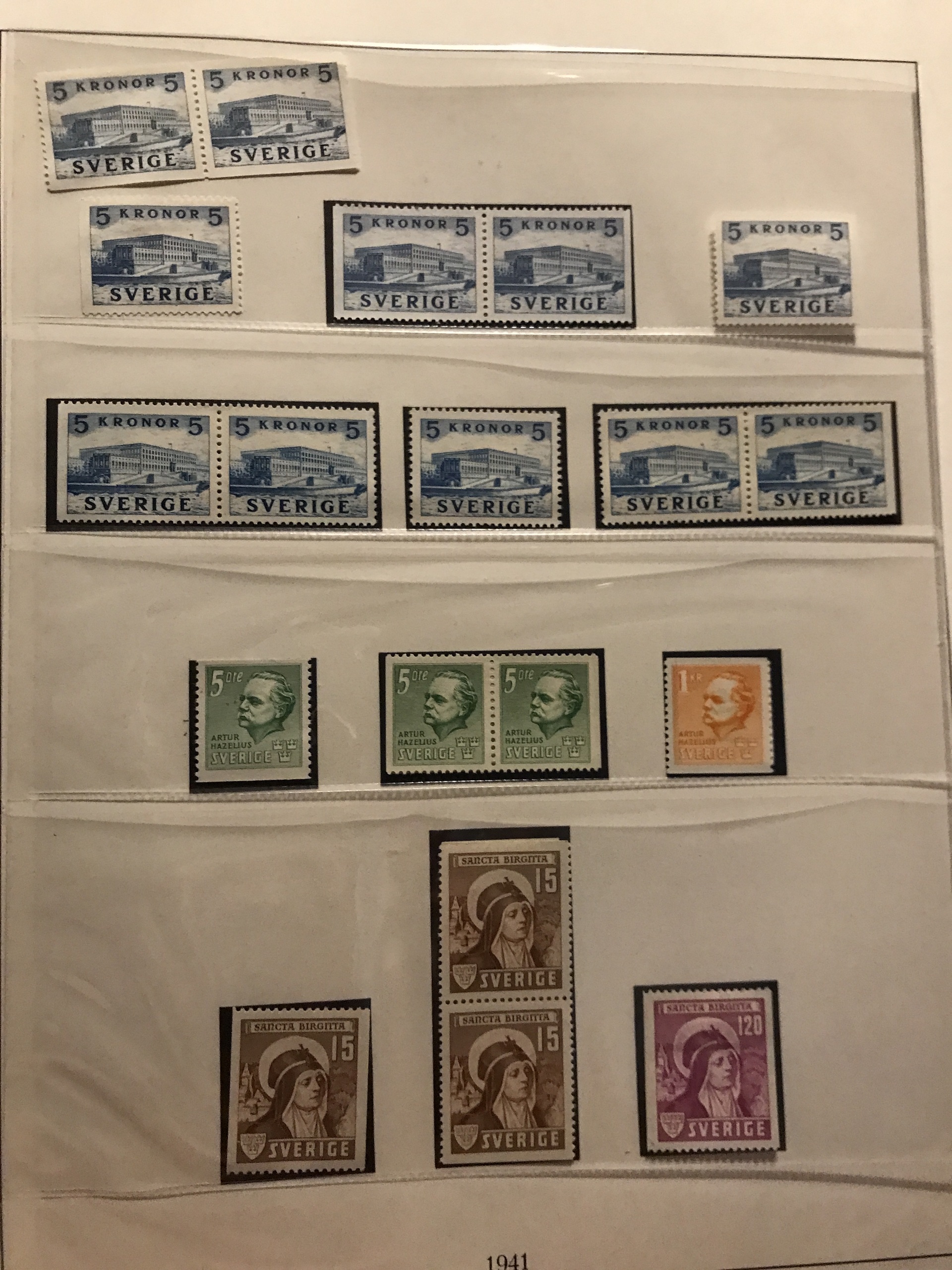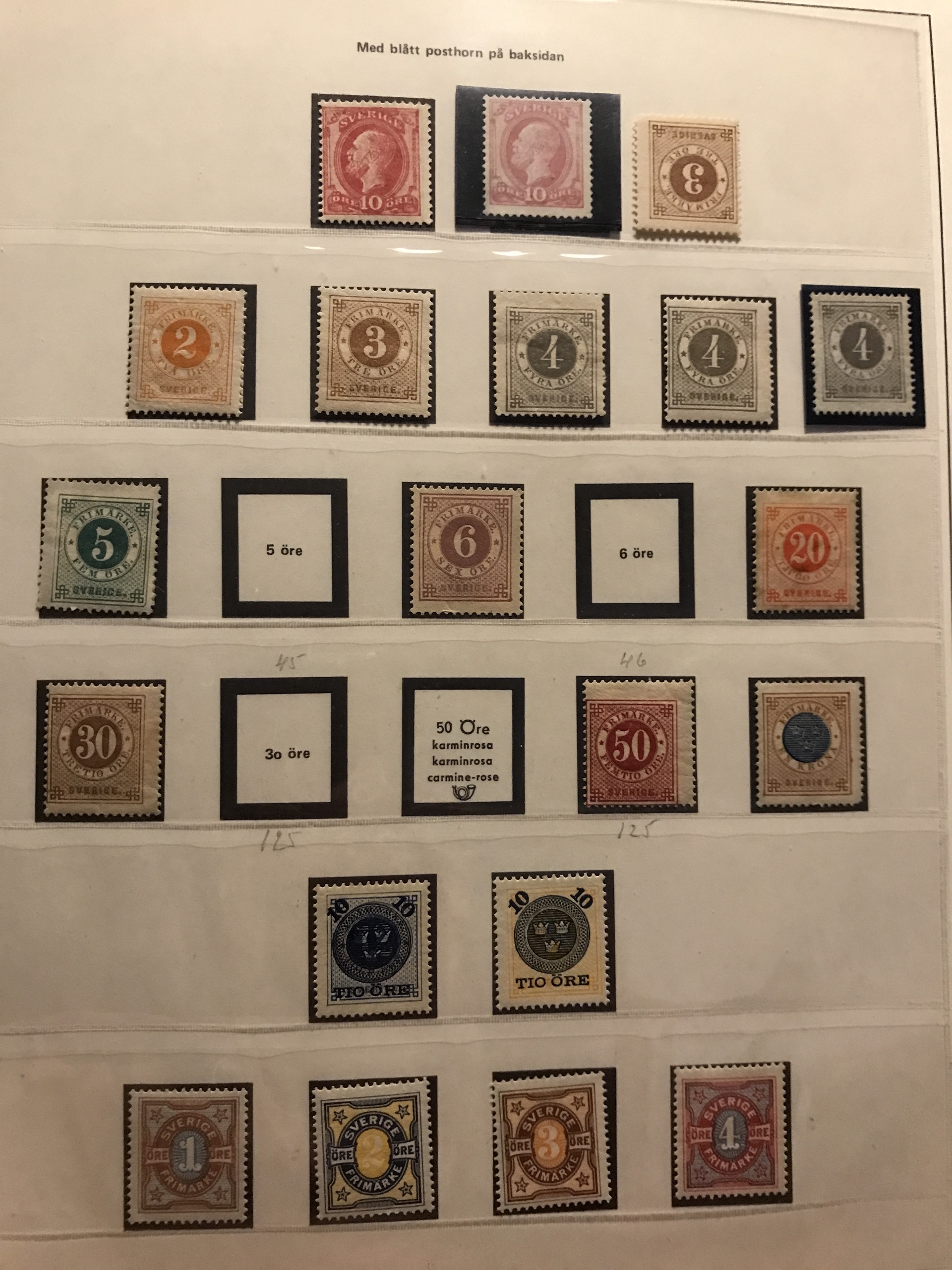 Sweden. ★★/★. Collection until 1945 in Lindner album incl. e.g. F1–2 and 5–6N, good Coat-of Arms and Lion types incl. some (*), nice Circle types, cpl. Oscar, F65 *, a weel-filled section Coil stamps mainly *, cpl. Landstorm, Congress and UPU incl. some **, F233b **, 22 ** BC/CB-pairs and 332BC+CB *, 337C**, some better officials- and postage due stamps, etc. Please see a selection of scans at www.philea.se. Mostly fine quality.