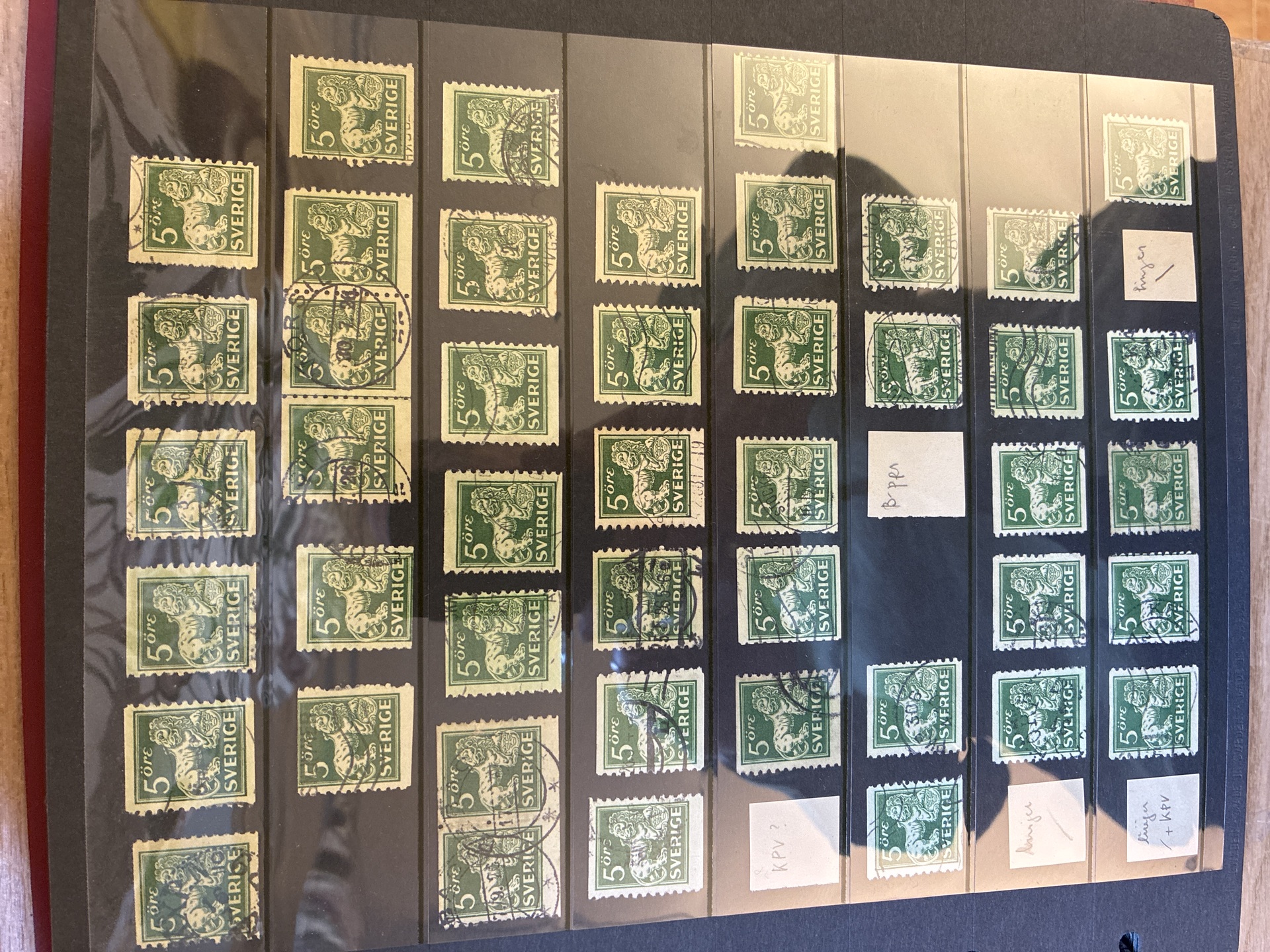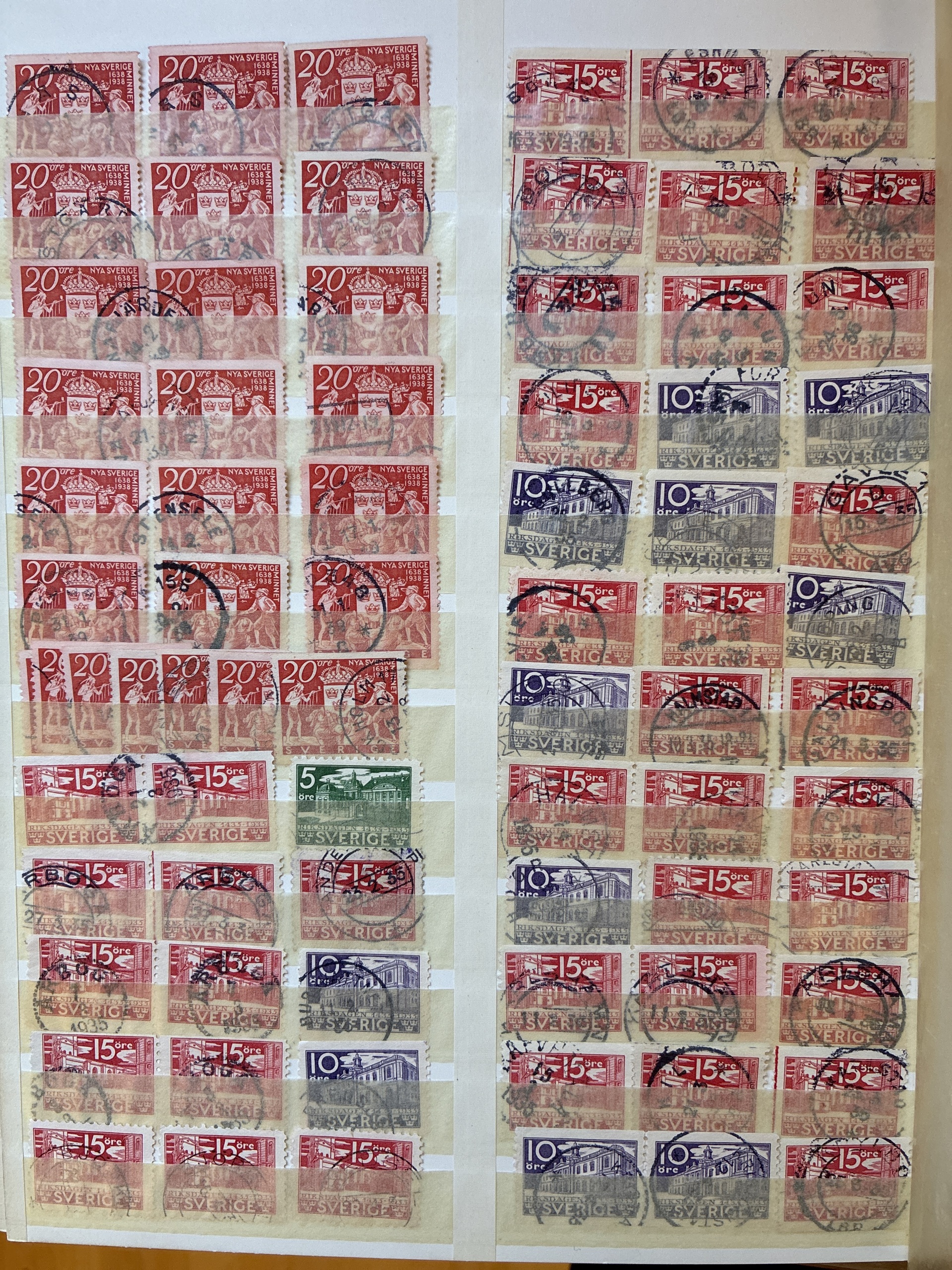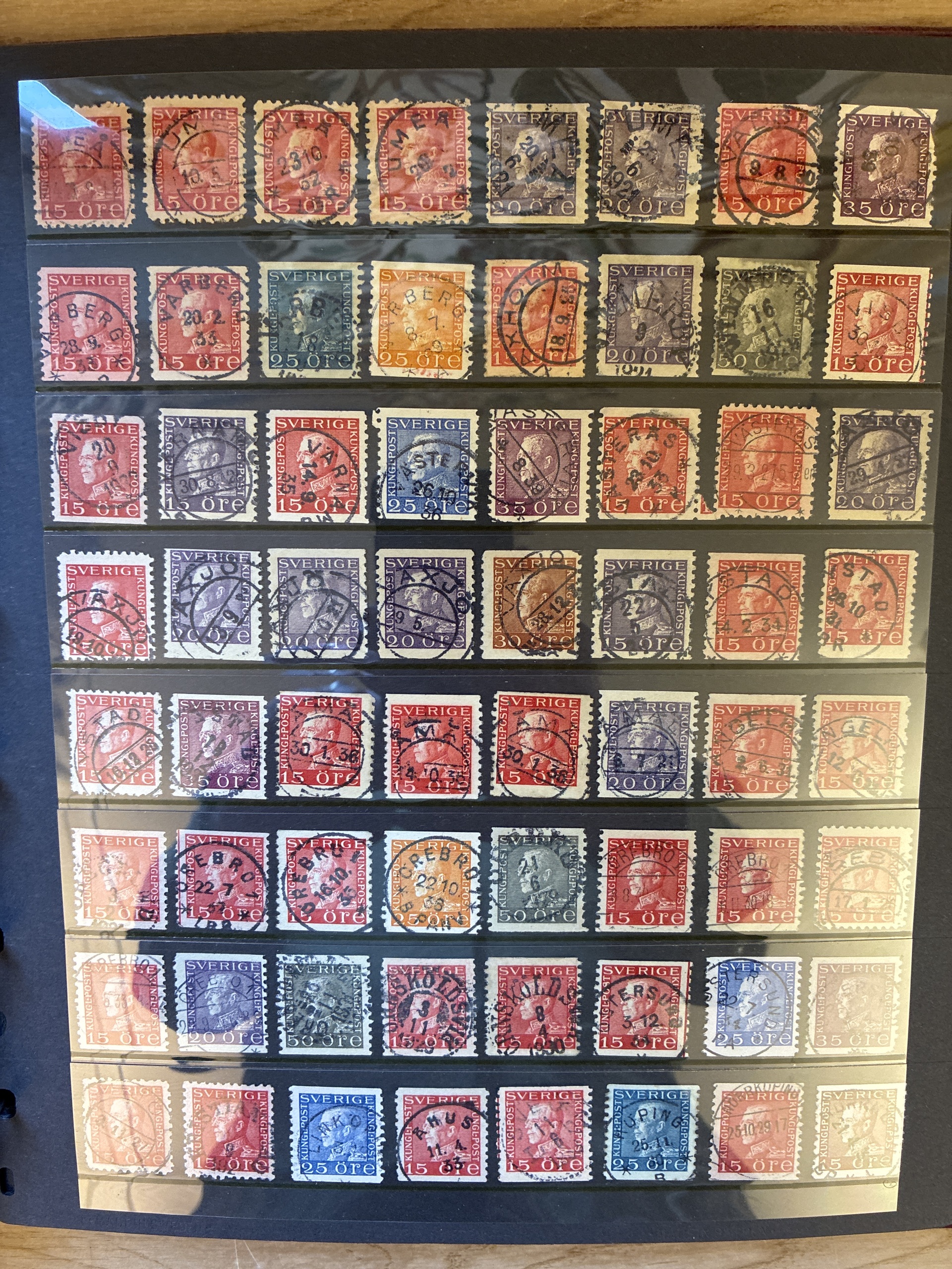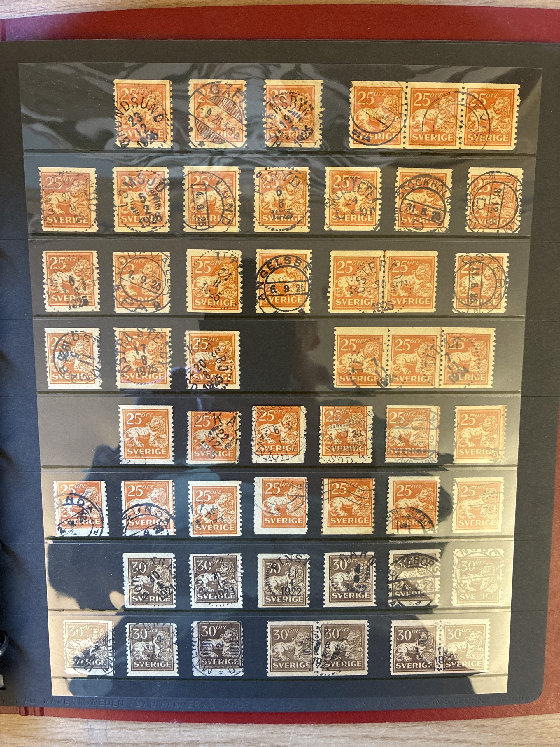Sweden. Accumulation used 1920–1940 in box. Coil stamps, four visir albums and three stockbooks. Many nice cancellations. Paper and watermarks, etc. Please see a selection of scans at www.philea.se. Approx. 10 kg.
