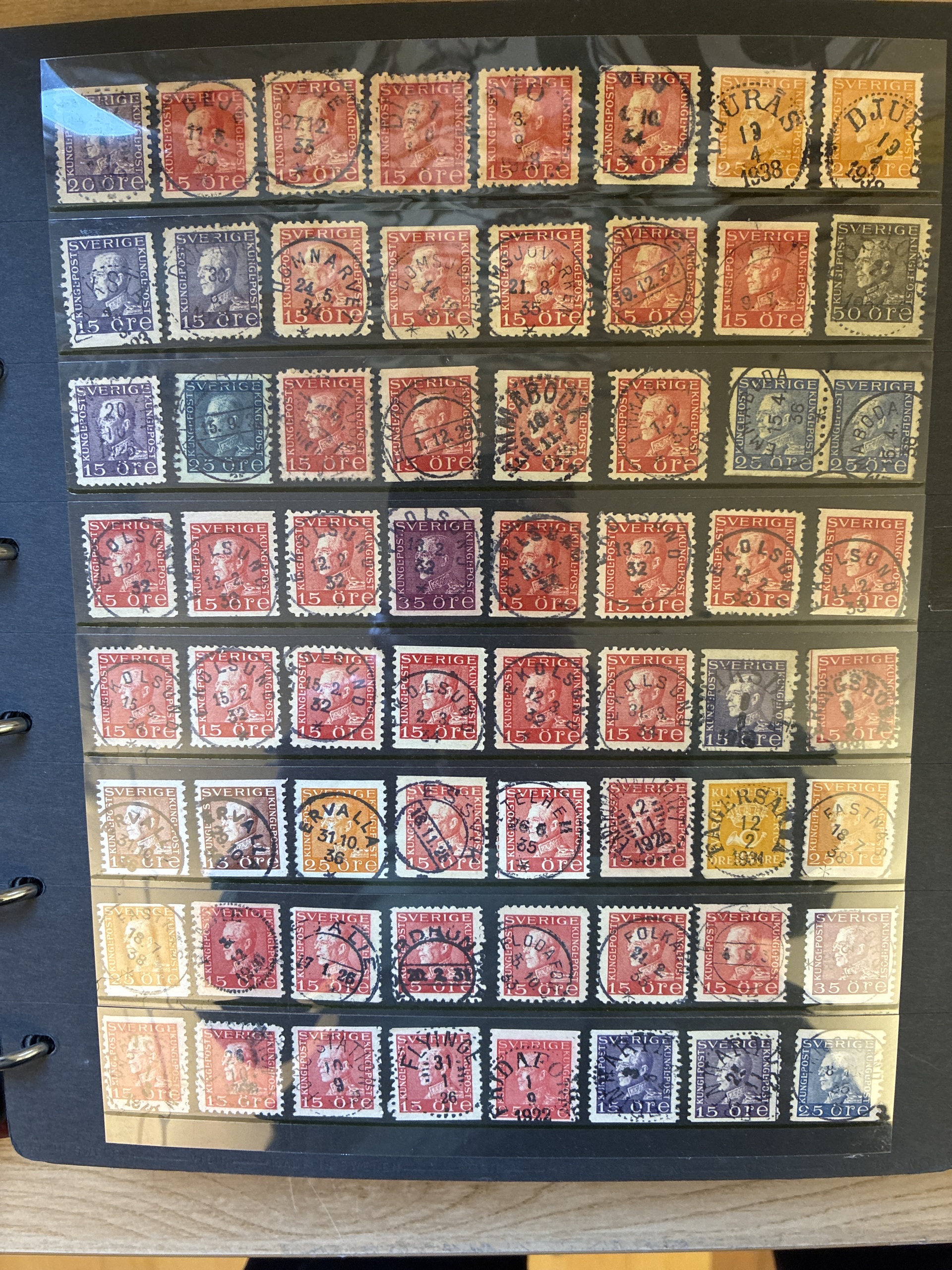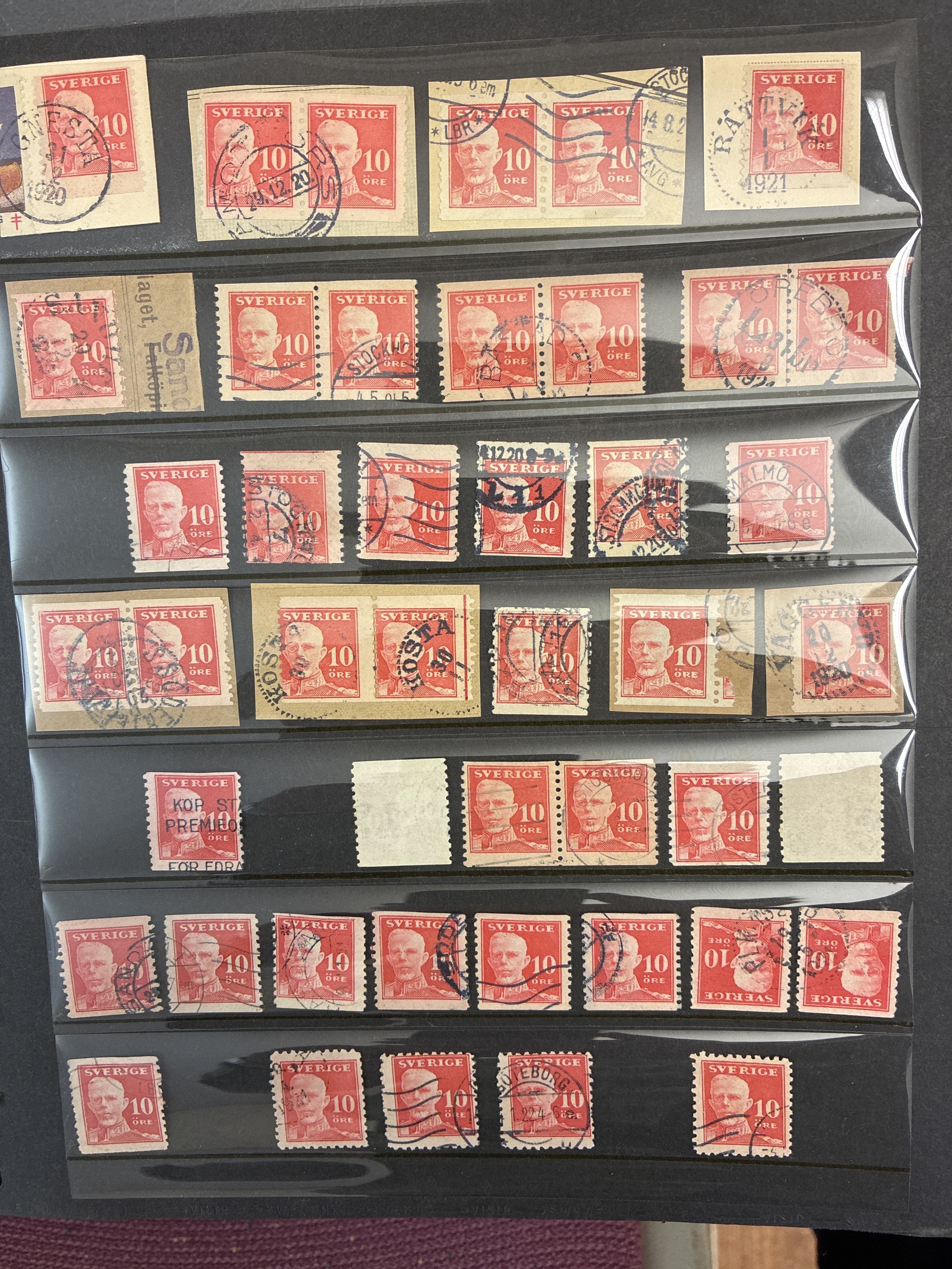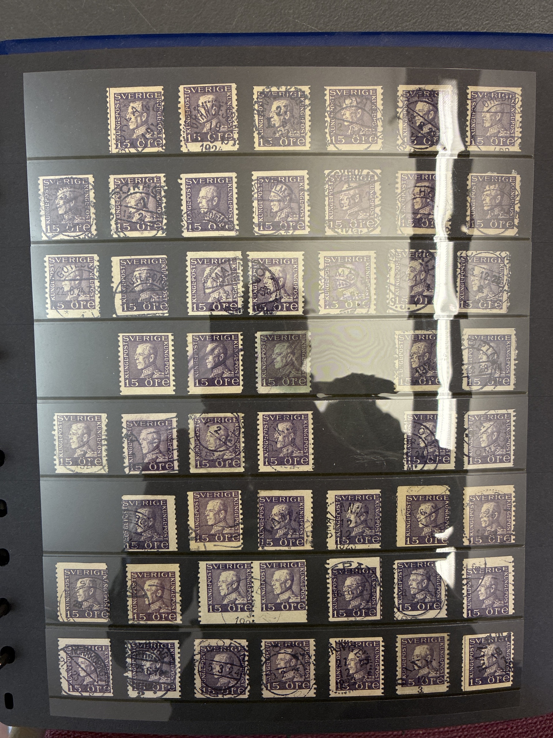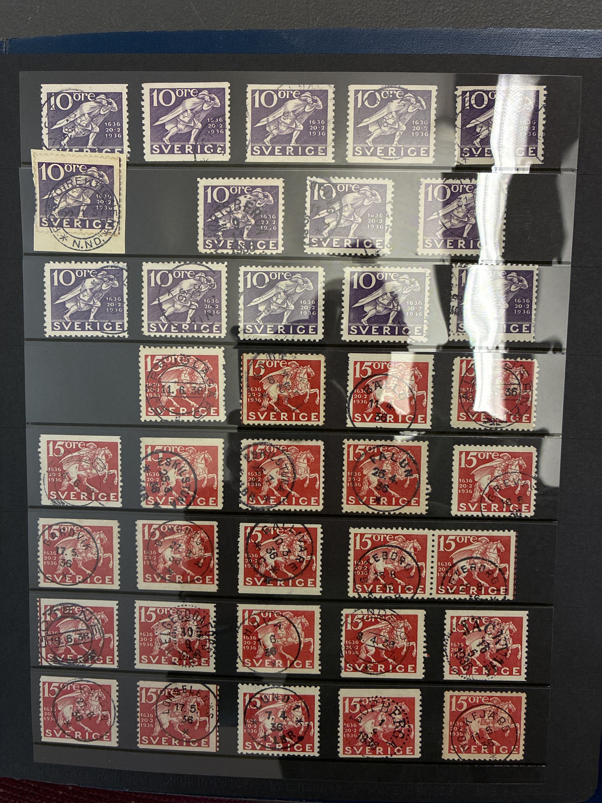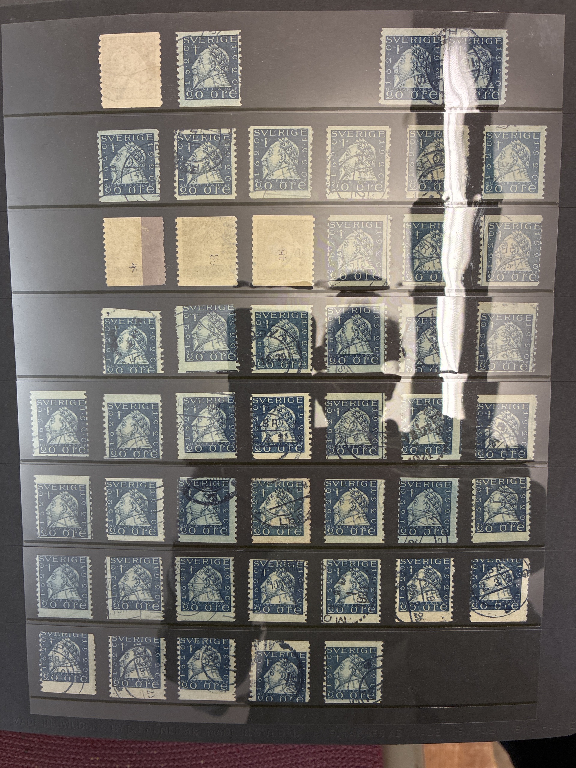Sweden. Accumulation used 1920–1940 in box. Coil stamps, four visir albums and three stockbooks. Many nice cancellations. Paper and watermarks, etc. Please see a selection of scans at www.philea.se. Approx. 10 kg.