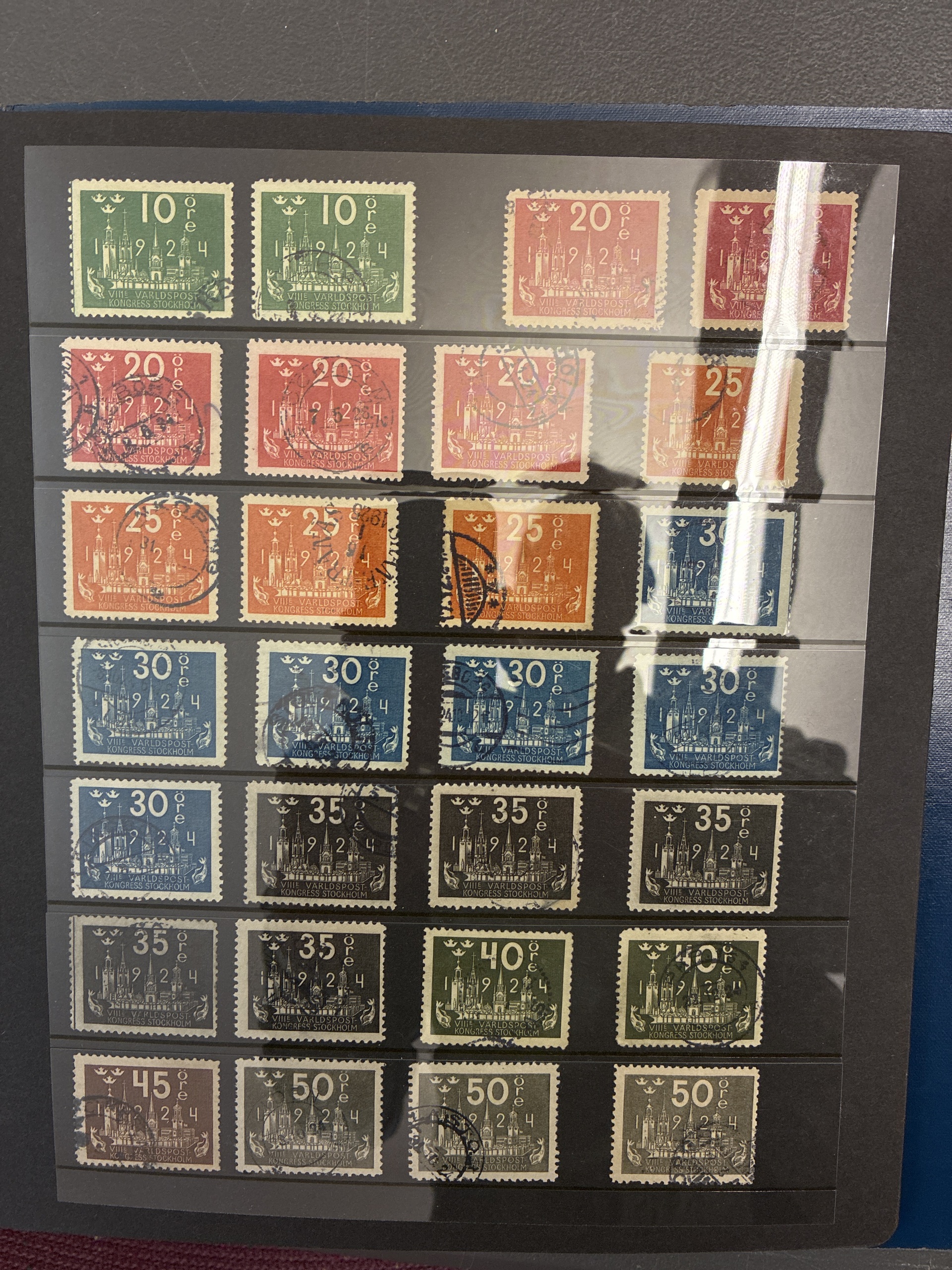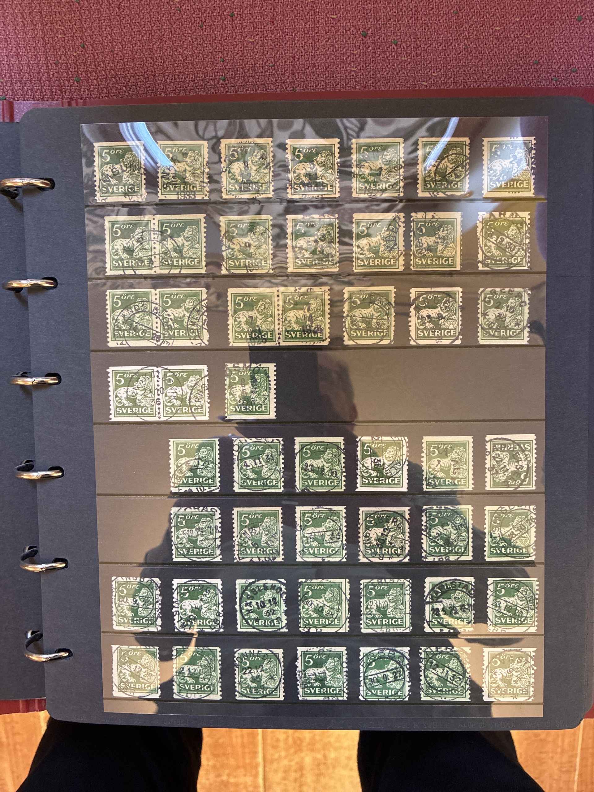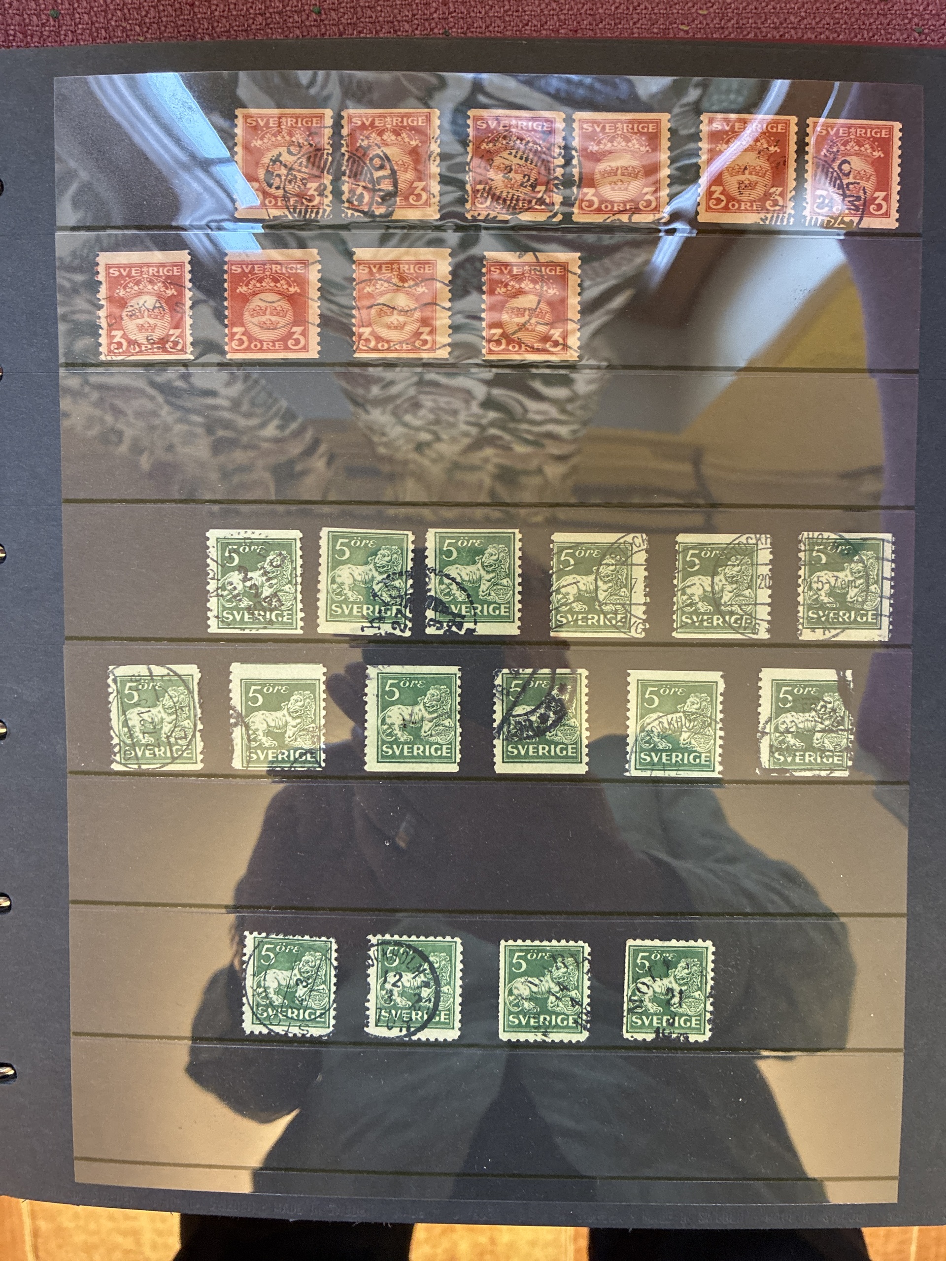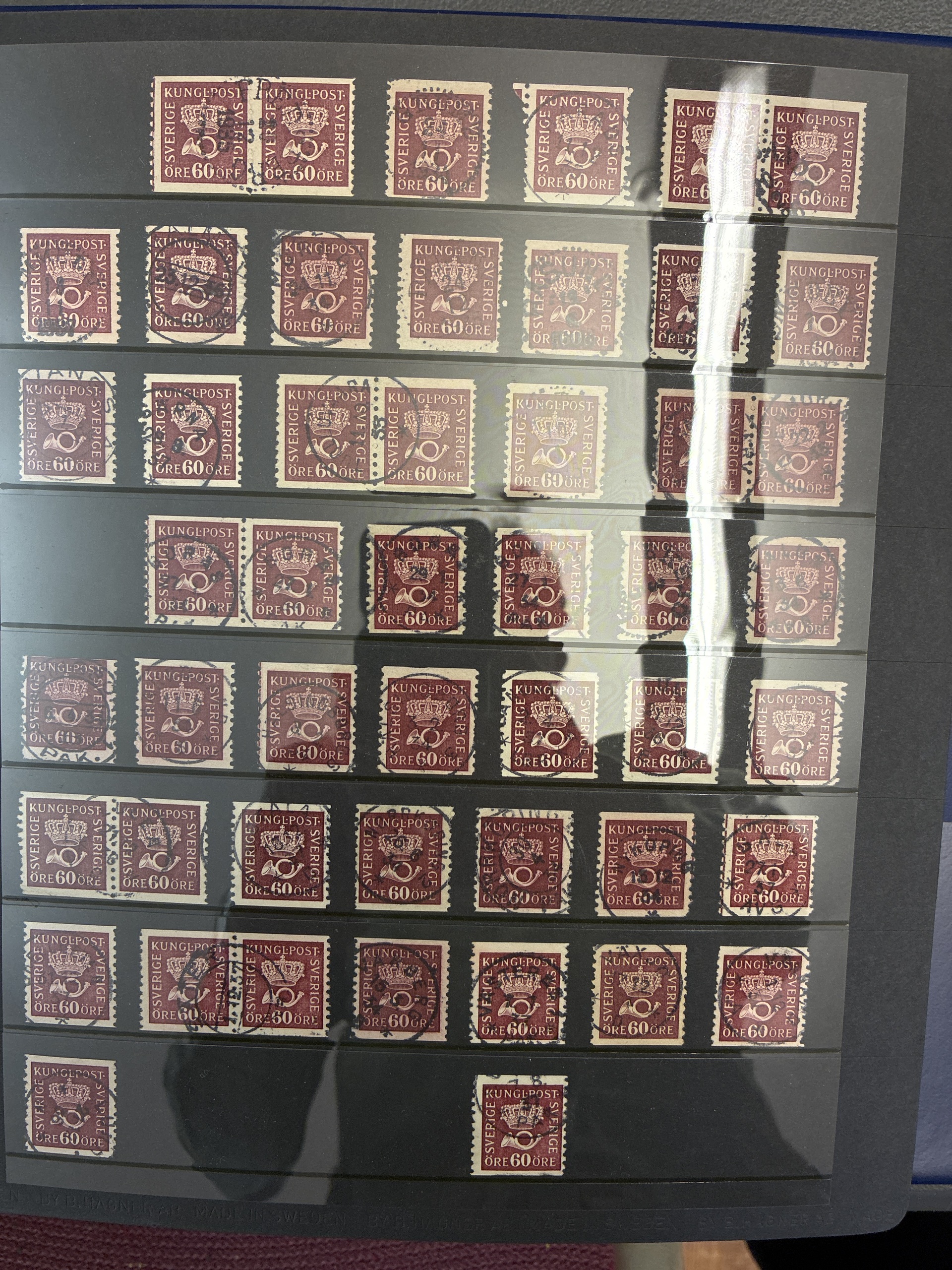 Sweden. Accumulation used 1920–1940 in box. Coil stamps, four visir albums and three stockbooks. Many nice cancellations. Paper and watermarks, etc. Please see a selection of scans at www.philea.se. Approx. 10 kg.
