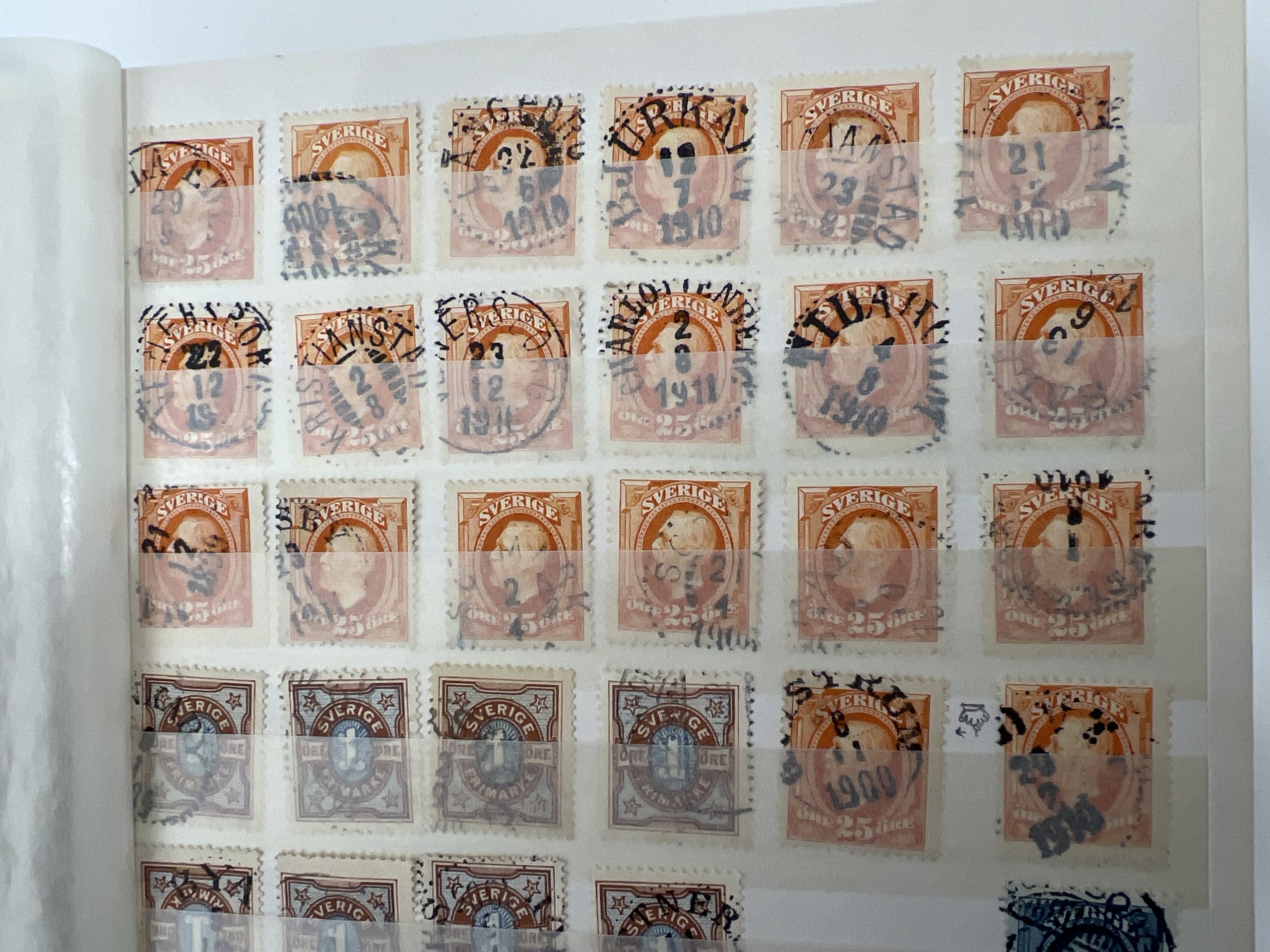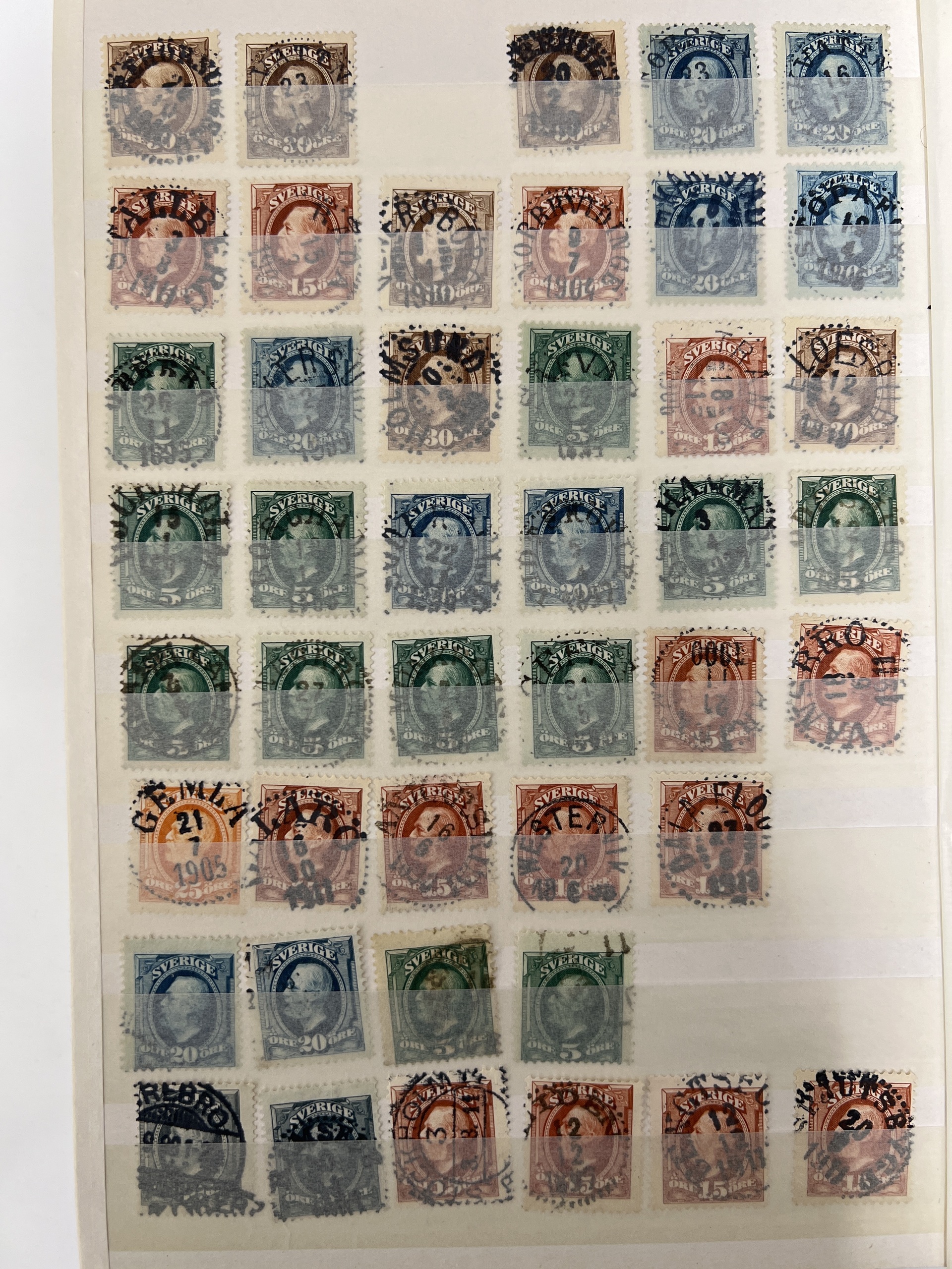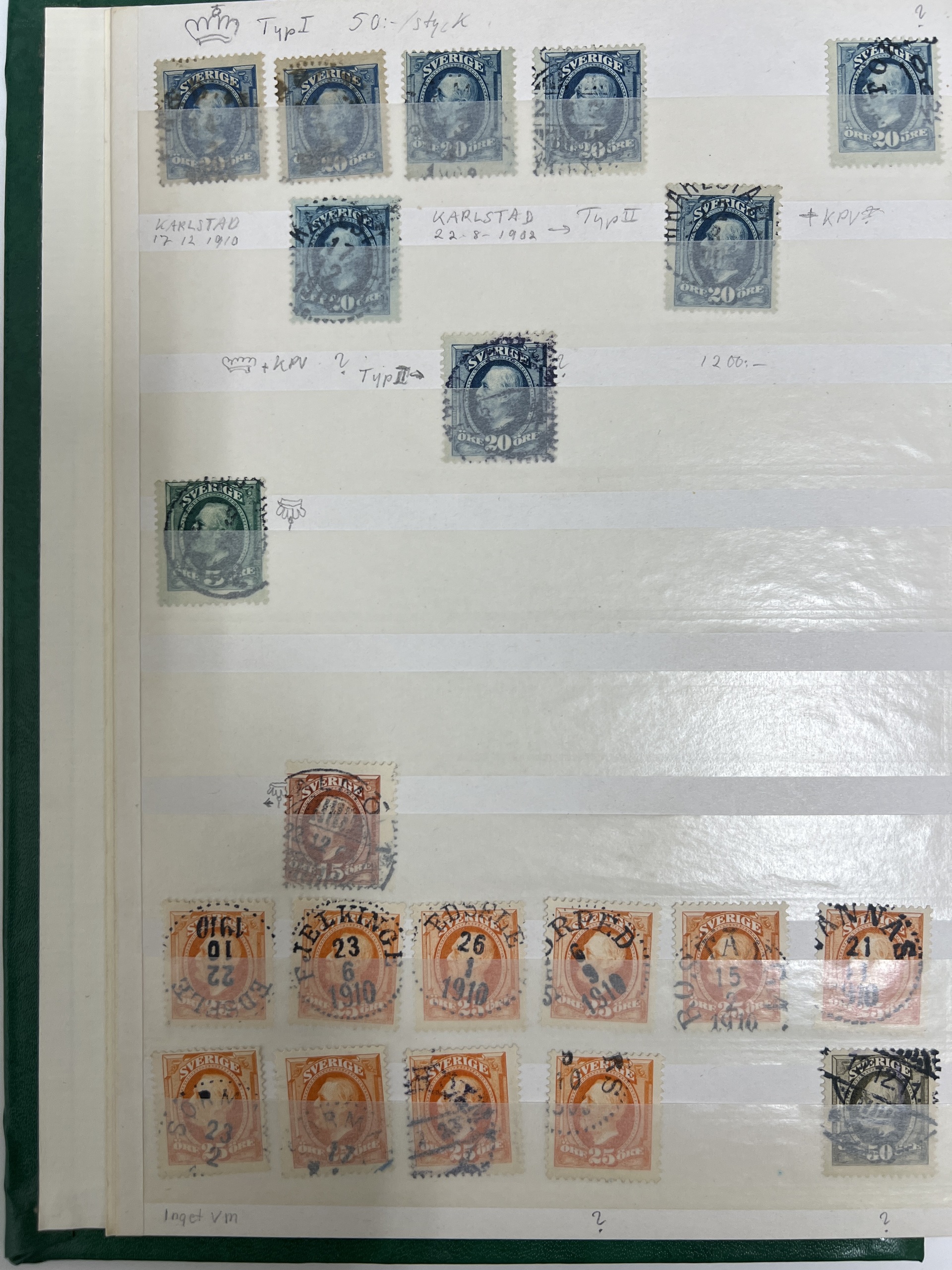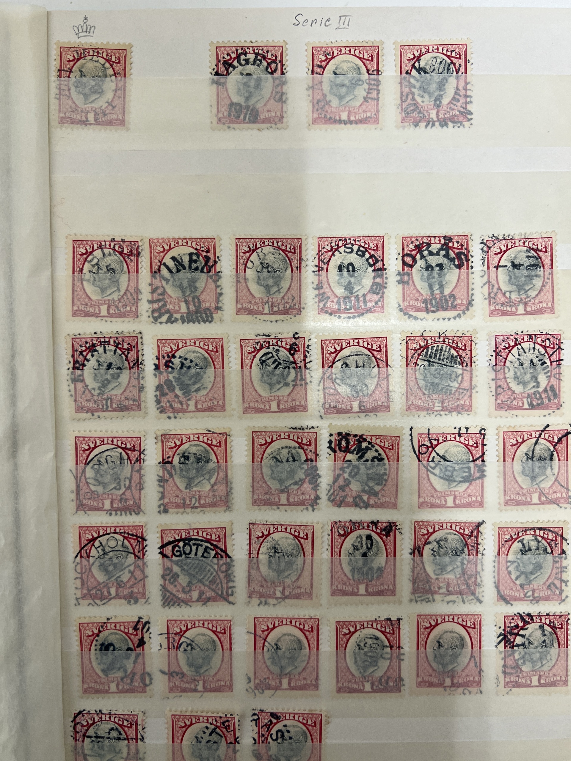 Sweden. Used 1900–1920s in small album without stamp mounts. A lot of stamps on Oscar II, Medallion and coil stamps with nice cancelations e.g. superb ones 1 kr Oscar II and 5 öre medaljong vm crown. Some variations like inverted vatermarks, etc on Oscar II. Please inspect. Mostly fine quality. (100s)