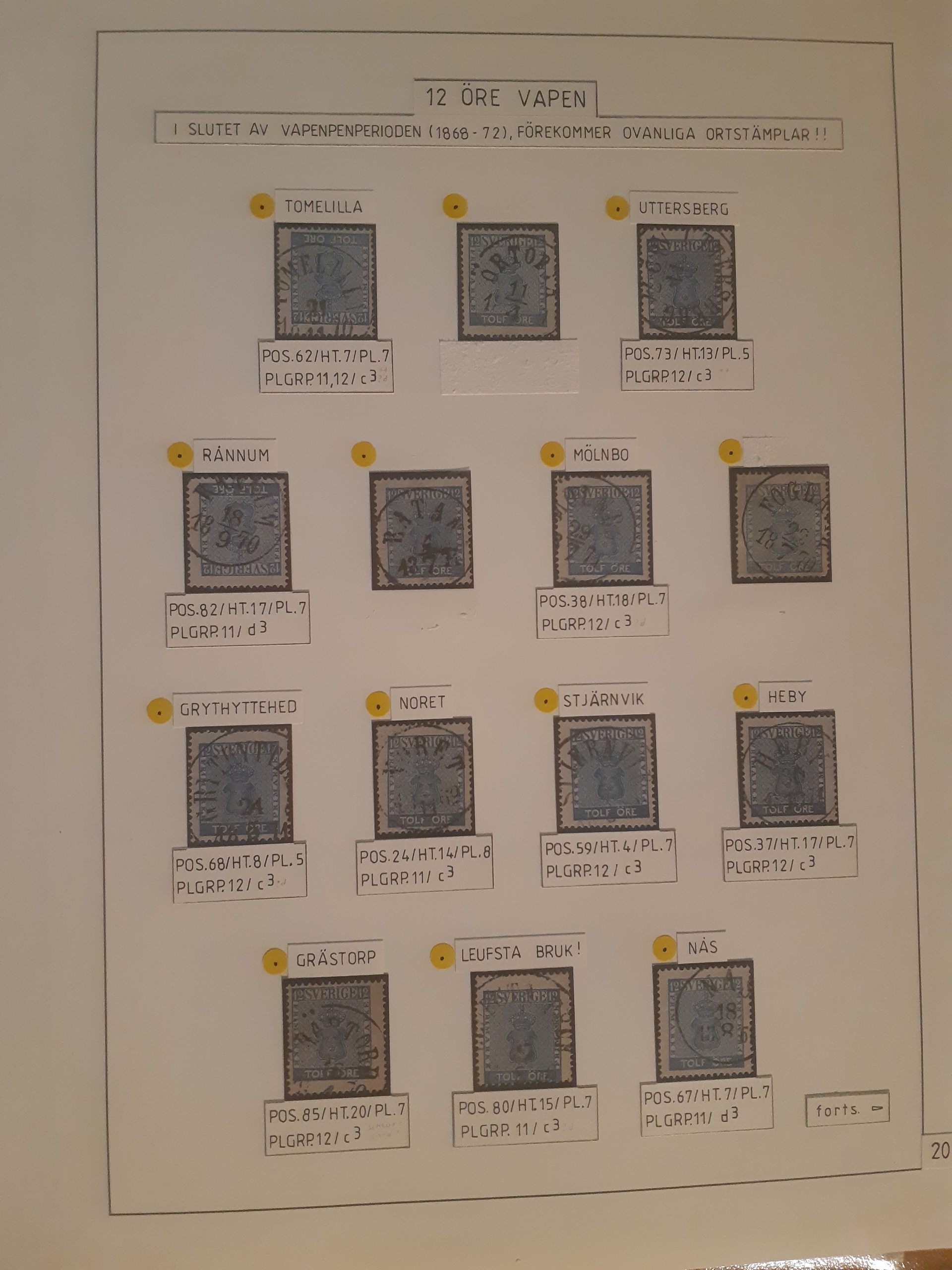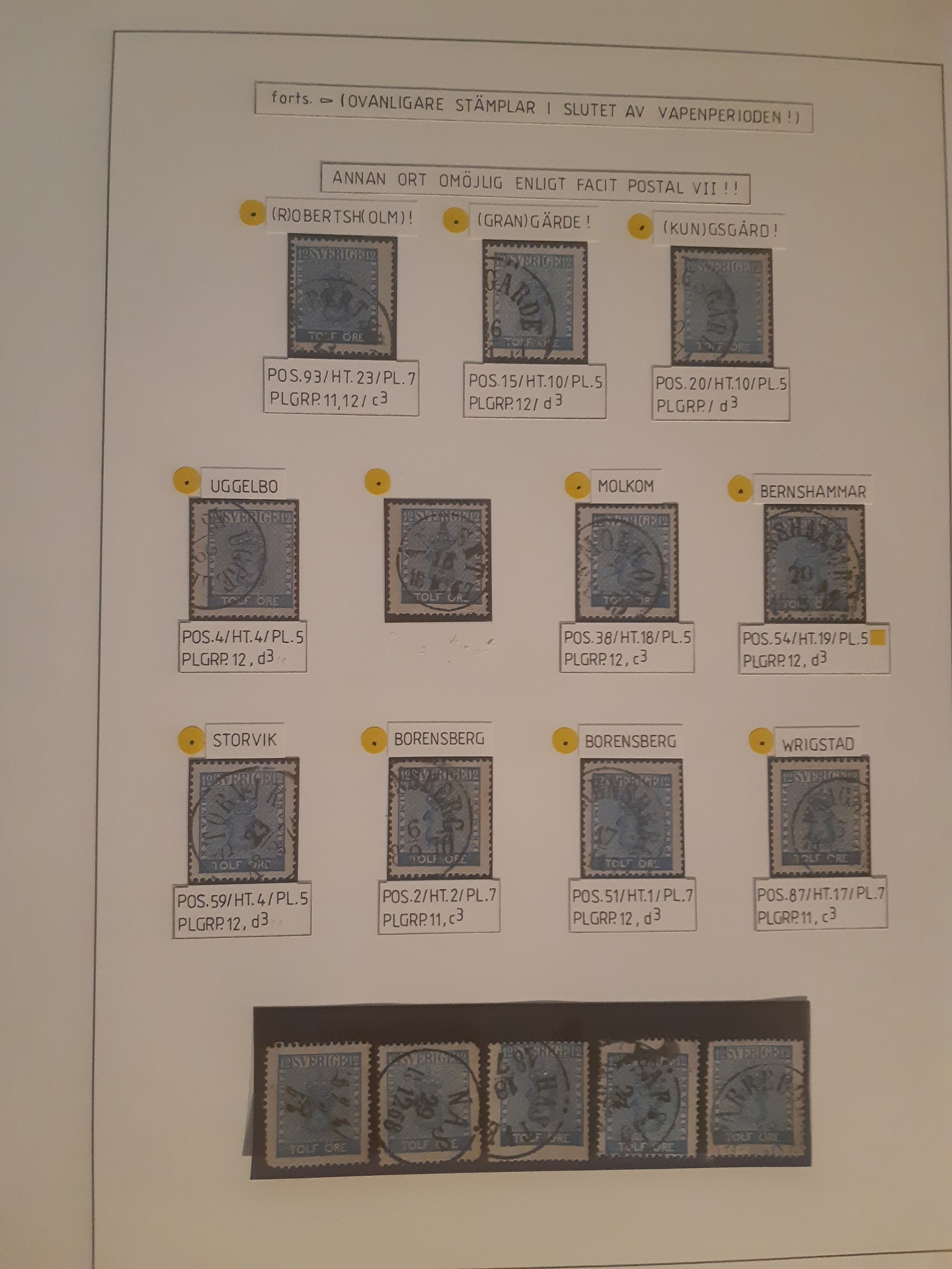 Sweden. Cancellations, collection 12 ÖRE COAT–OF–ARMS on leaves. E.g. BERNSHAMMAR, MOLKOM, RATAN, RÅNNUM, TOMELILLA, UTTERSBERG, etc. The entire lot is presented at www.philea.se. Somewhat mixed quality. (37)