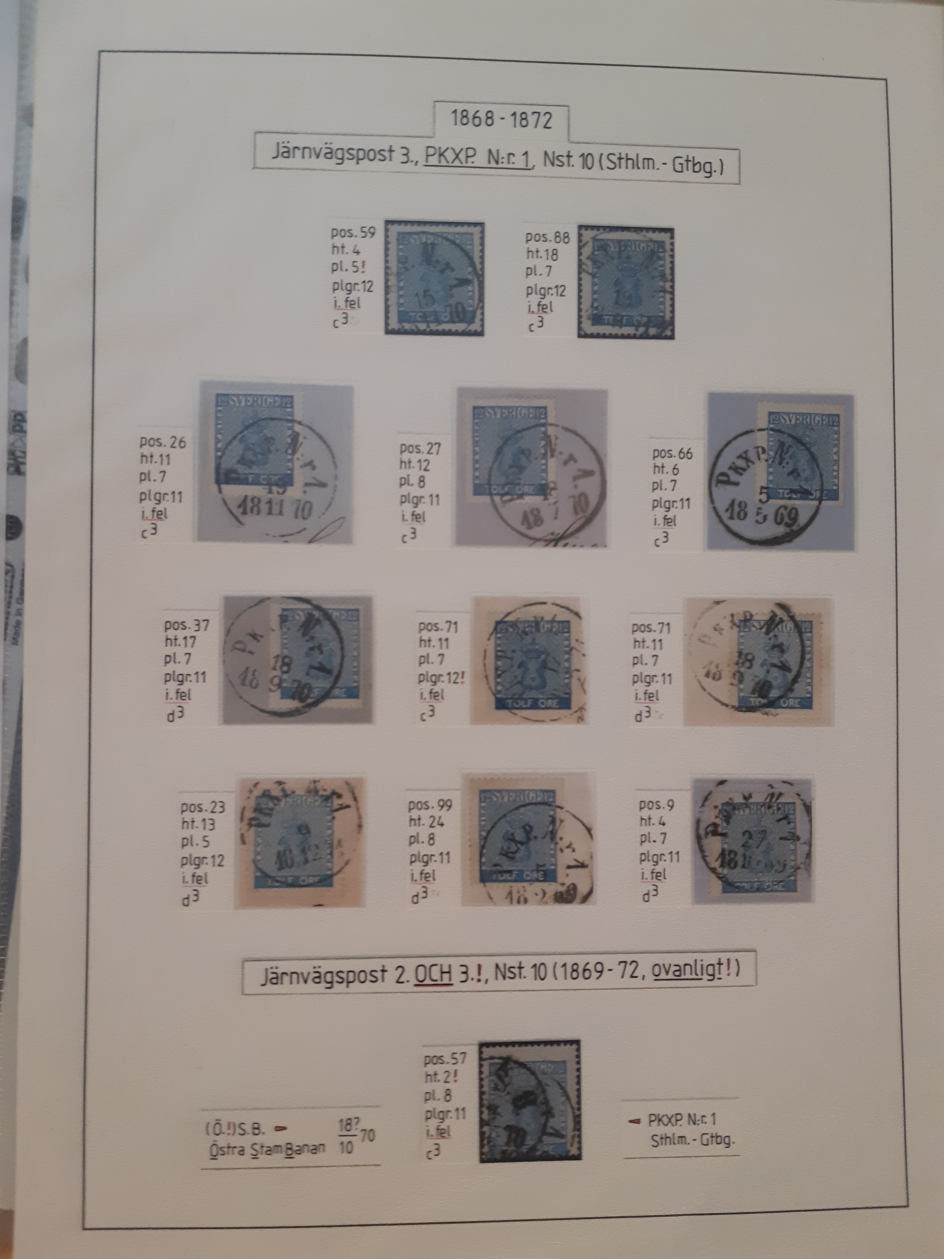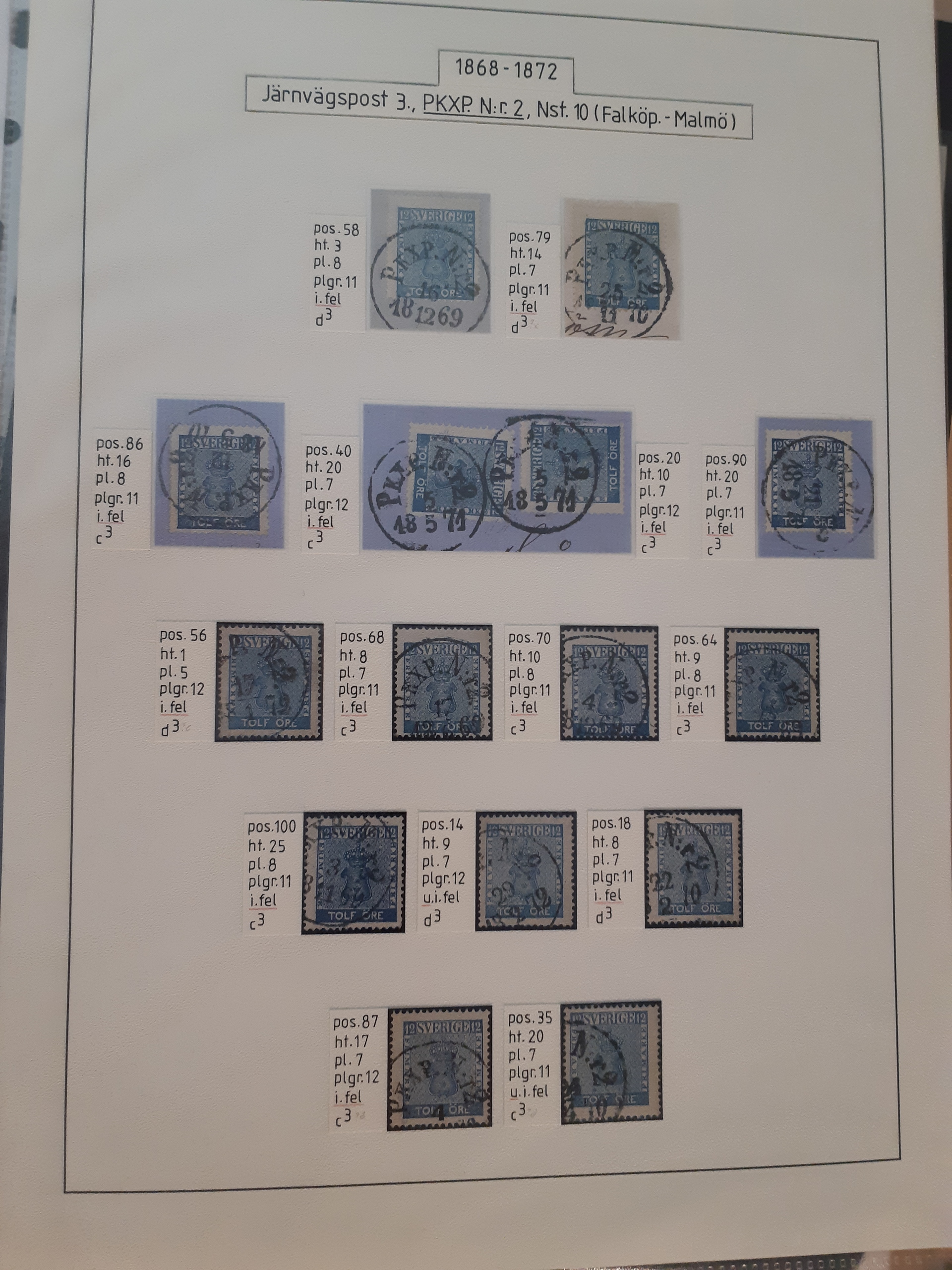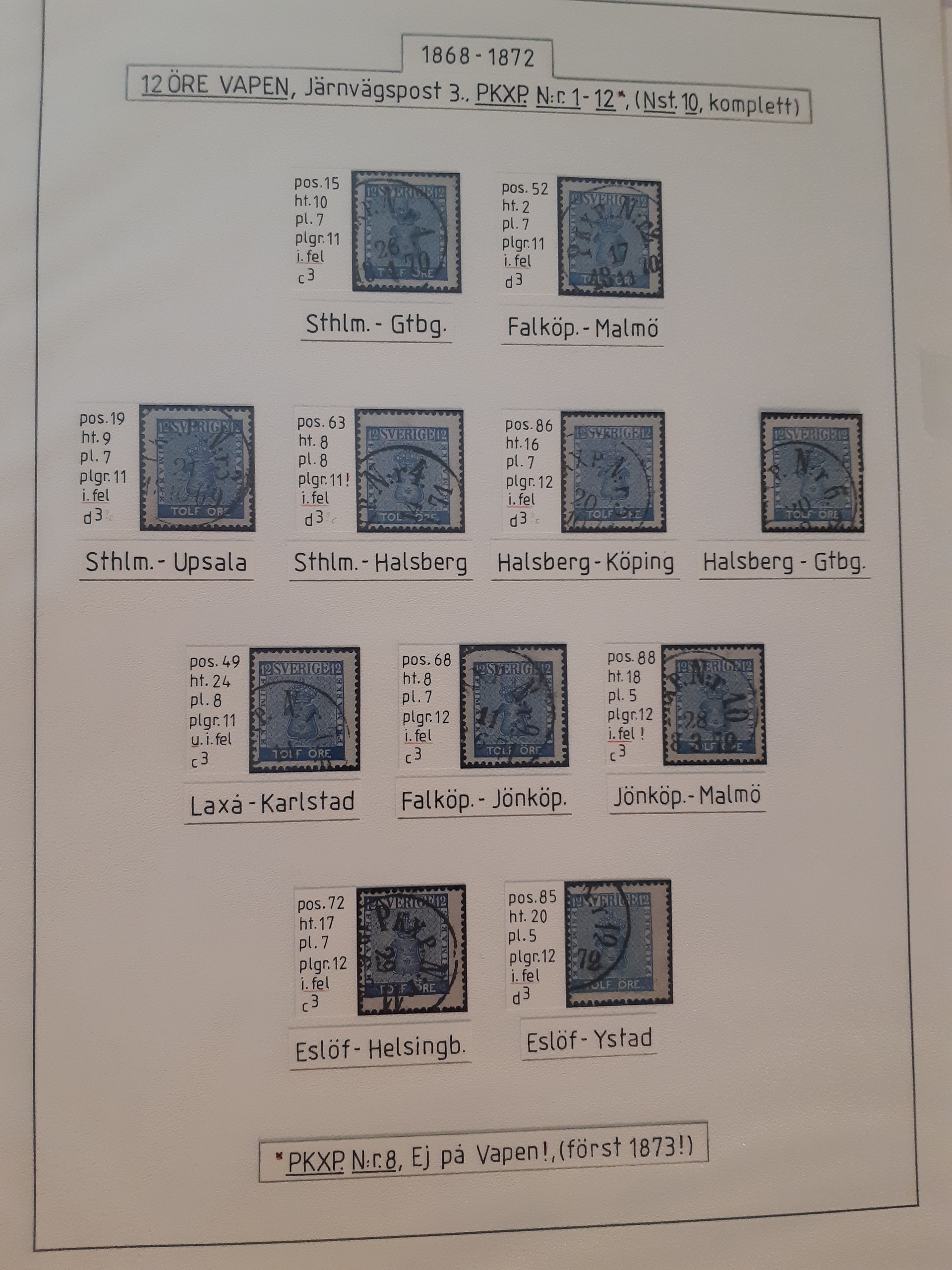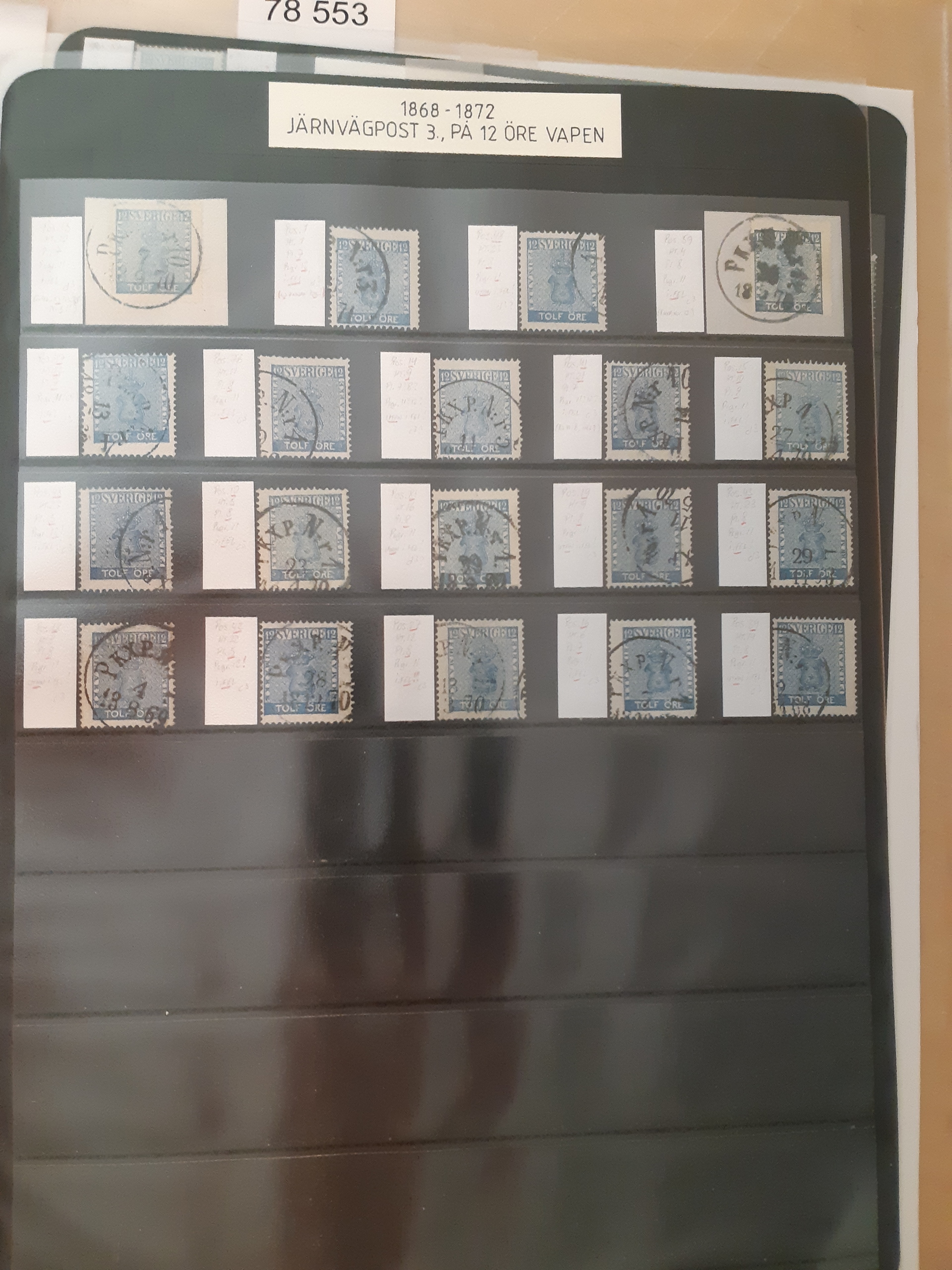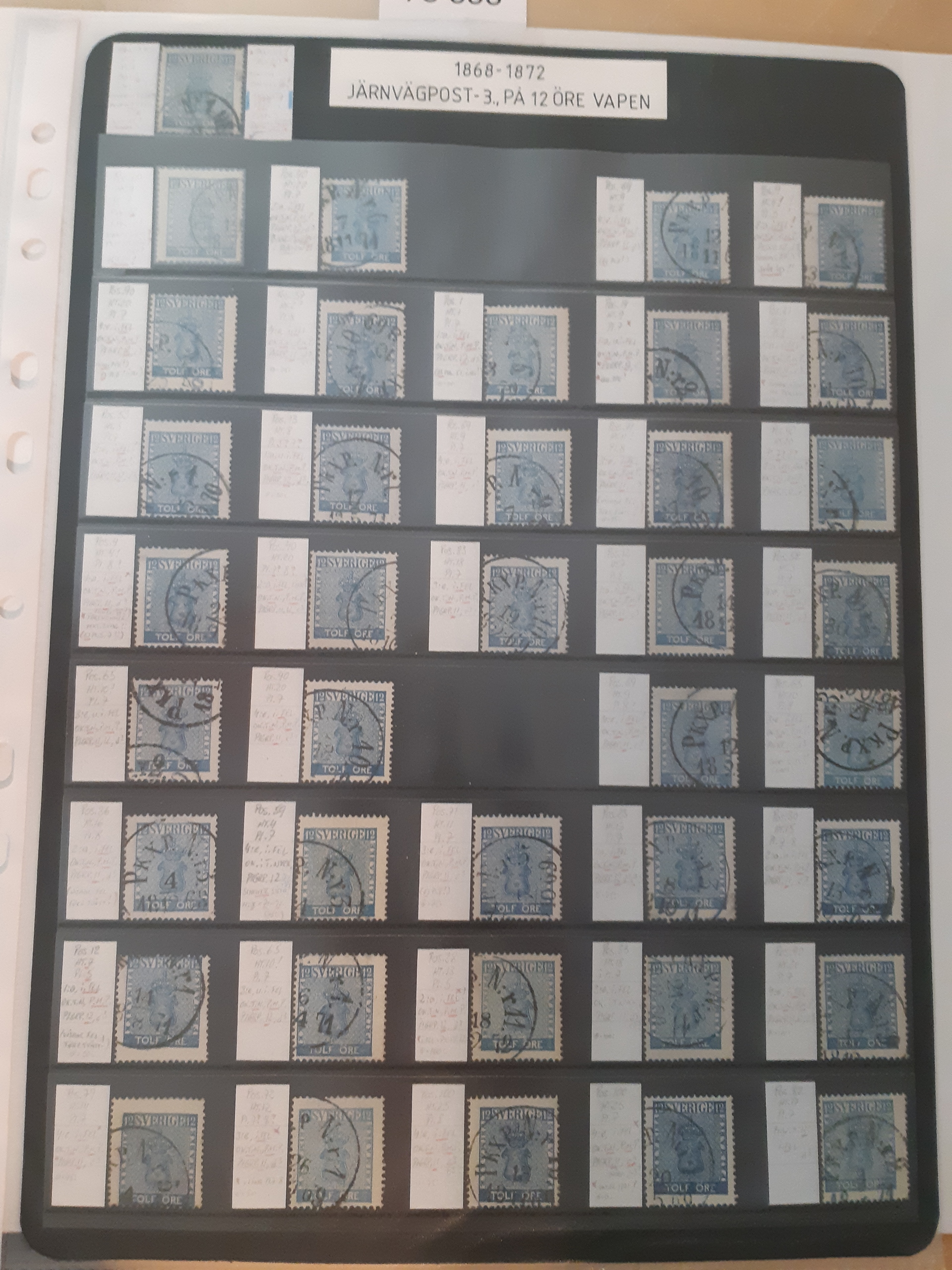 Sweden. Cancellations, collection RAIL WAY PMKS on leaves. PKXP Nr 1–12 on 12 öre Coat-of-Arms. Readable–superb cancellations. The entire lot is presented at www.philea.se. (95)