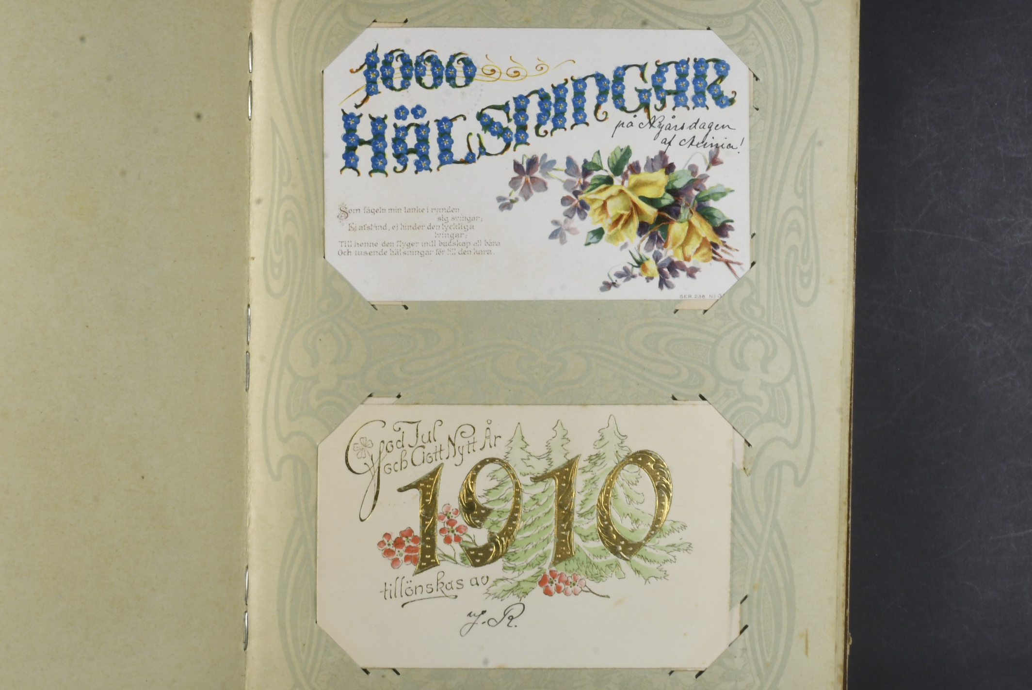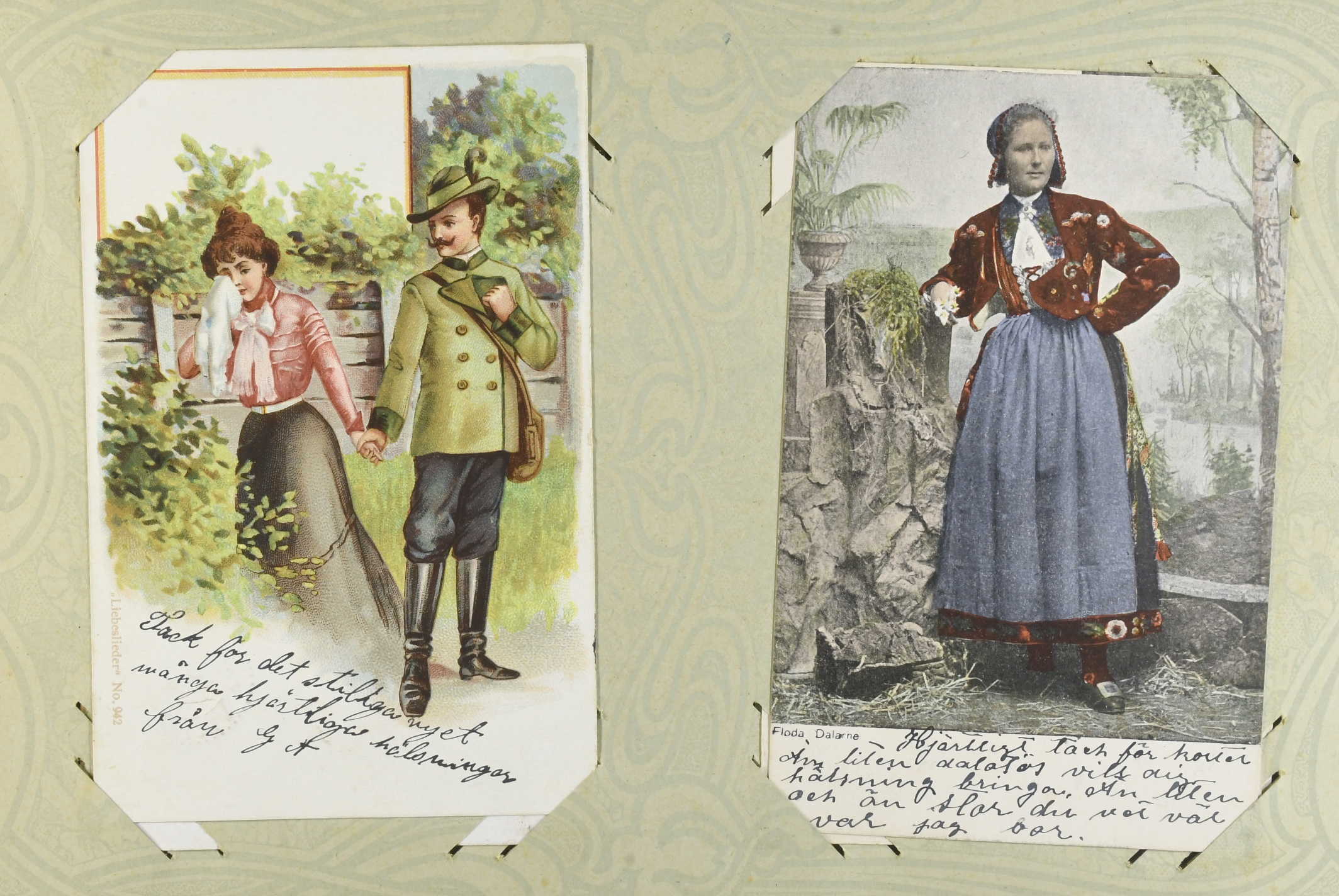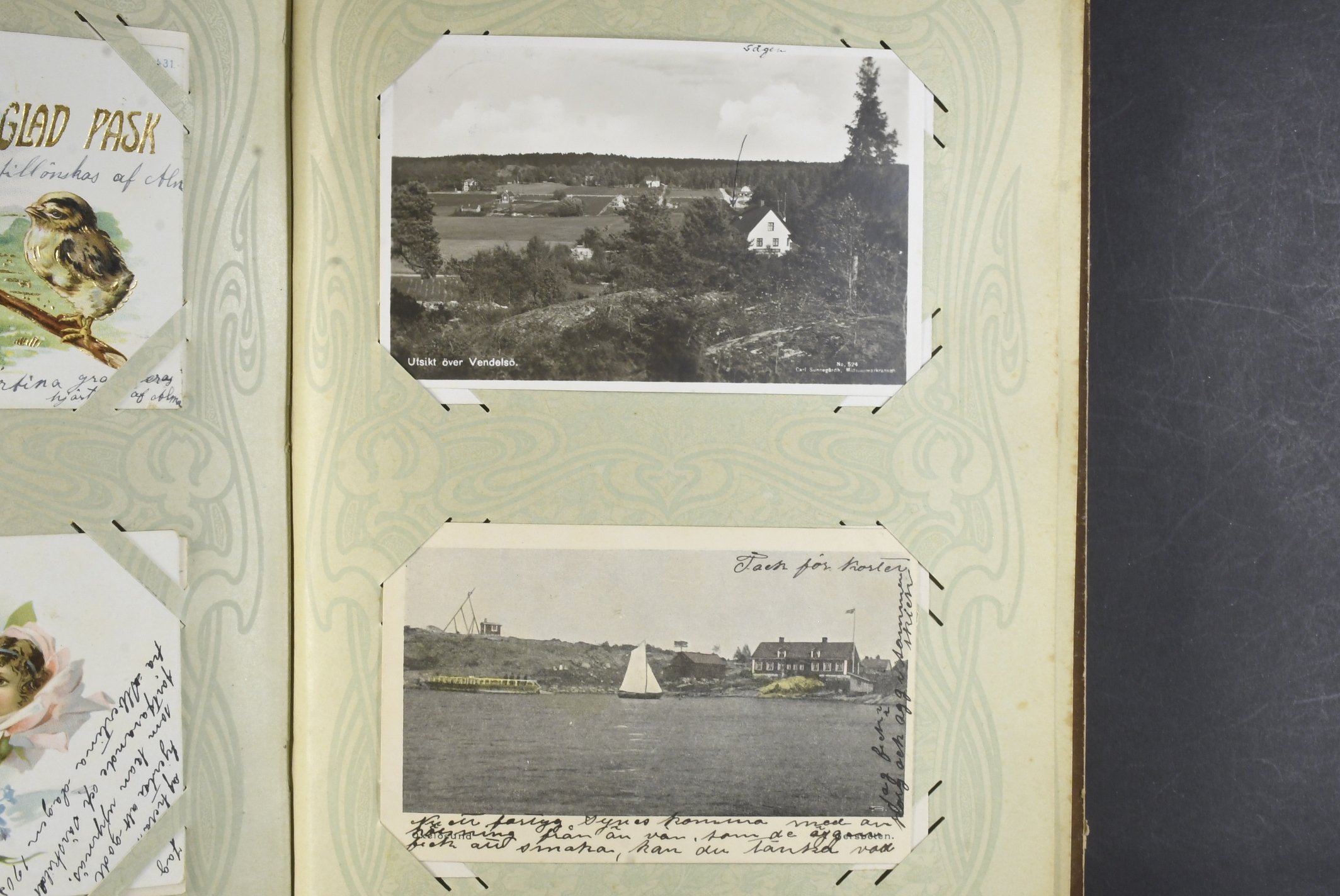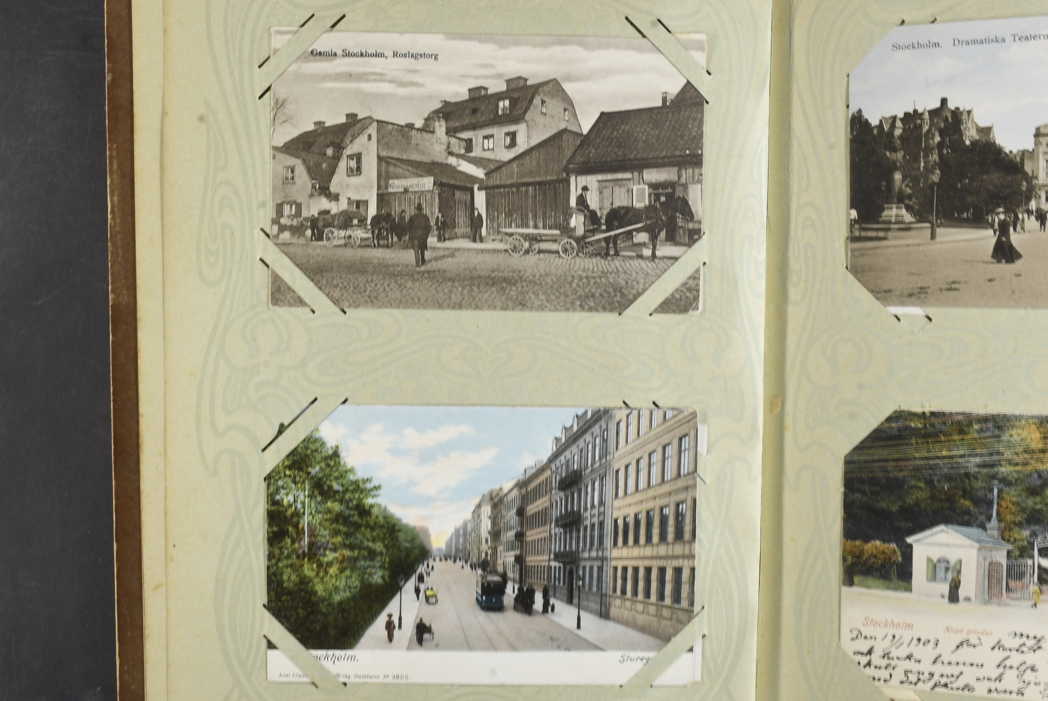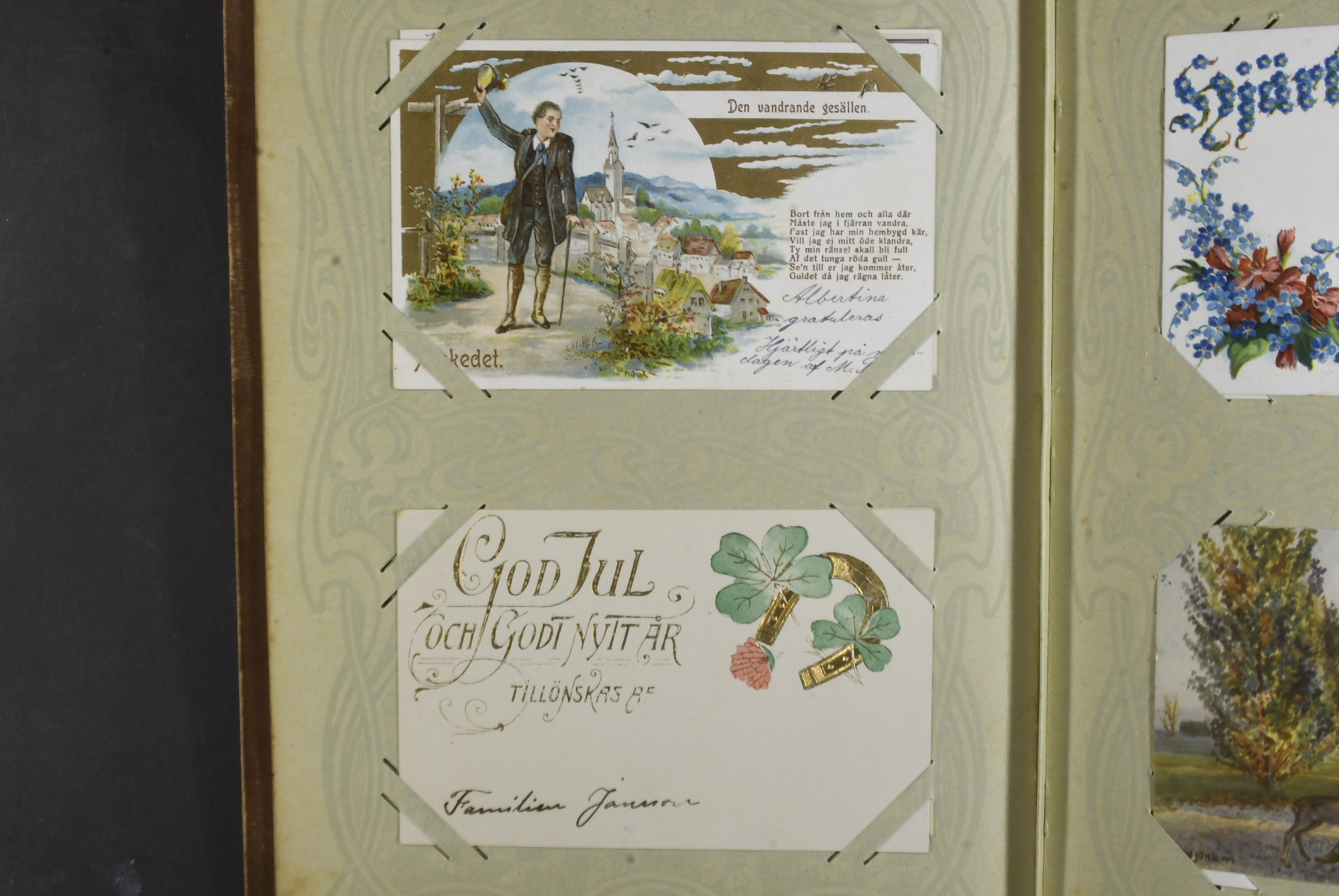 Sweden. Picture postcards, accumulation 1900–1915 in album. 96 coloured postcards, mostly celebration of holidays, birthdays or important private events. Also a number of topographic cards from Stockholm with surroundings incl. a very nice material. Please see a selection of scans at www.philea.se. Mostly fine quality.