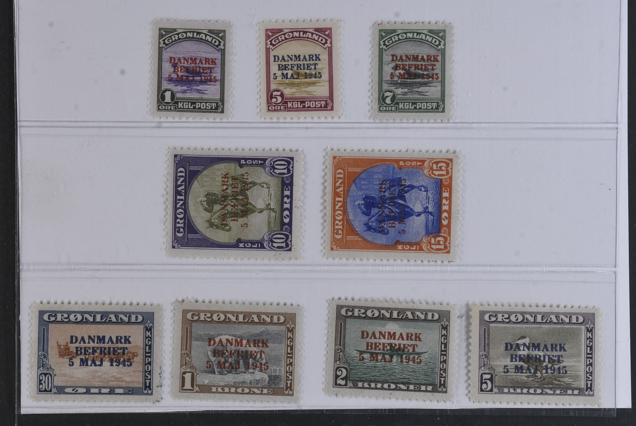 Greenland. Facit 19–27 ★, 1945 Danmark Berfriet SET (9). 10 øre wih red overprint. SEK 8450
