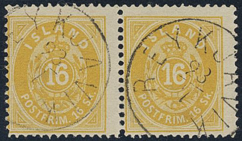 Iceland. Facit 4 in pair used, 1873 Skilding values 16 sk yellow, perf 14 × 13½. CTO, Almost off-centered. Pair. SEK 10000