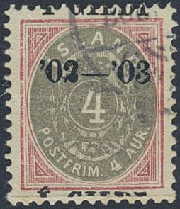 Iceland. Facit 50 used, 1902 Surcharge “Í GILDI” 4 aur grey/red, perf 12¾, black overprint. Overprint displaced. Crease at bottom.