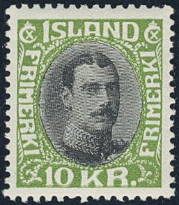 Iceland. Facit 157 ★, 1931 King Christian X 10 Kr black/green close, unbroken lines. Perfect centering. SEK 2000