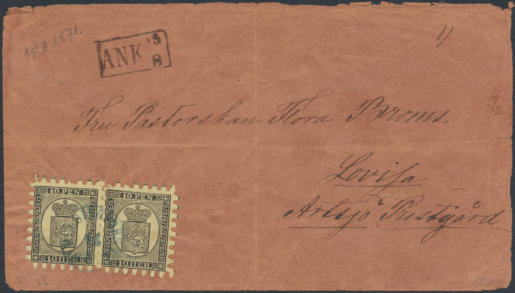 Finland. Facit 7 on cover, 1866 Coat-of-Arms Finnish values 10 p black on yellow paper. Two copies in partly divided pair. Helsingfors to Lovisa, unclear date. arrival ANK 15.8. Folds, both horizontal and vertical. SEK 17000