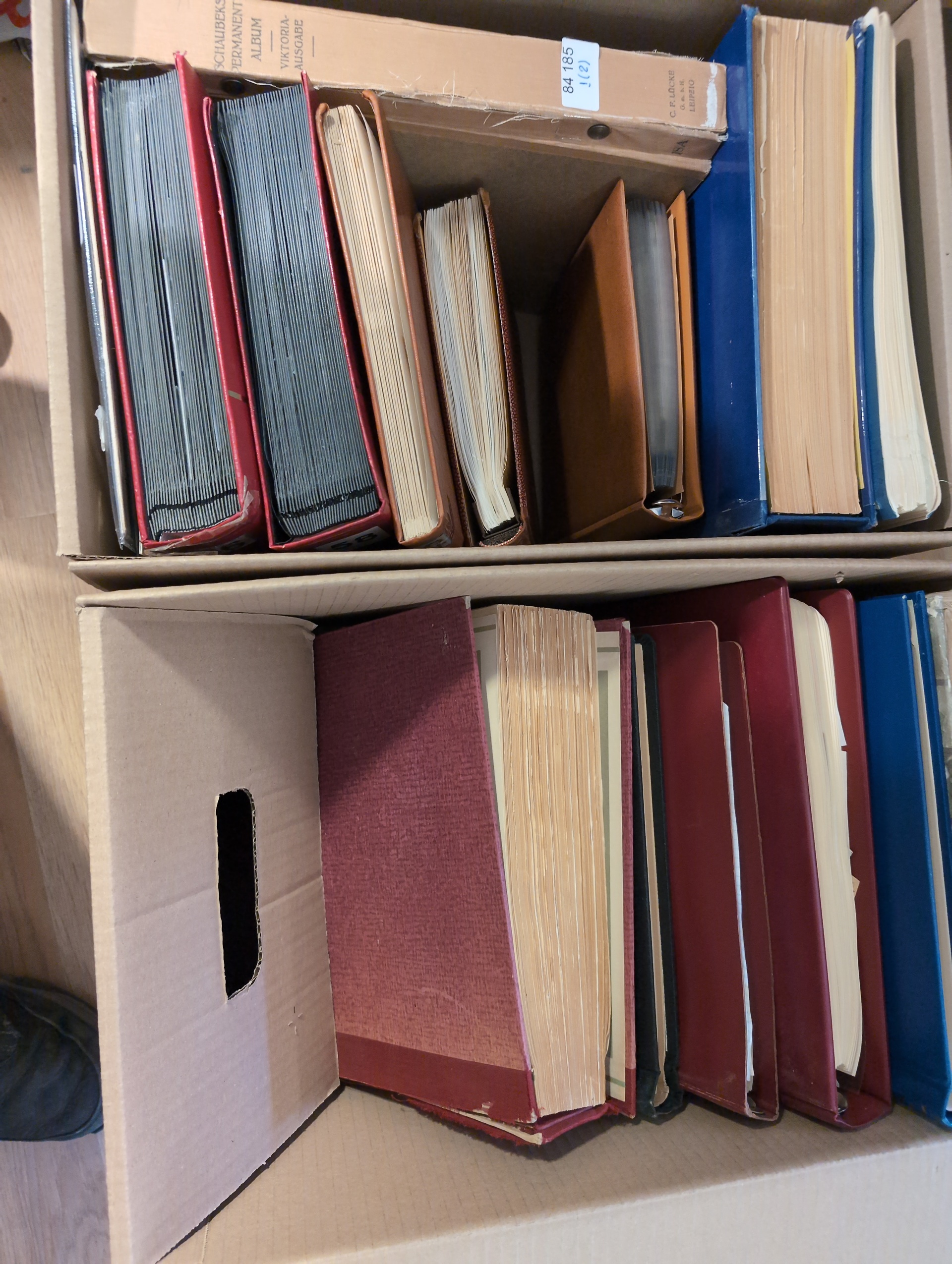 ALL WORLD. Accumulation ★★/★/⊙ 1870s–1990s in two medium removal boxes. 13 albums and stockbooks with much duplicates and mostly common stamps. Mostly Europe. Some of the albums are affected by moisture. Please see a selection of scans at www.philea.se. Somewhat mixed quality. Approx. 29 kg. (1000s)