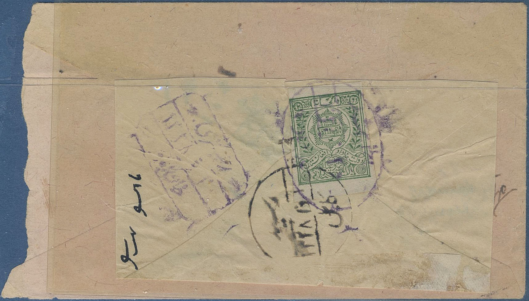 Afghanistan. Michel 181–82 on cover, franked on reverse with1909 1a blue tied by PESHSWAR oval cancel, and 2a green Amir Habibullah Khan issue imperf at front. The cover is a bit rouffly opened, scarce.