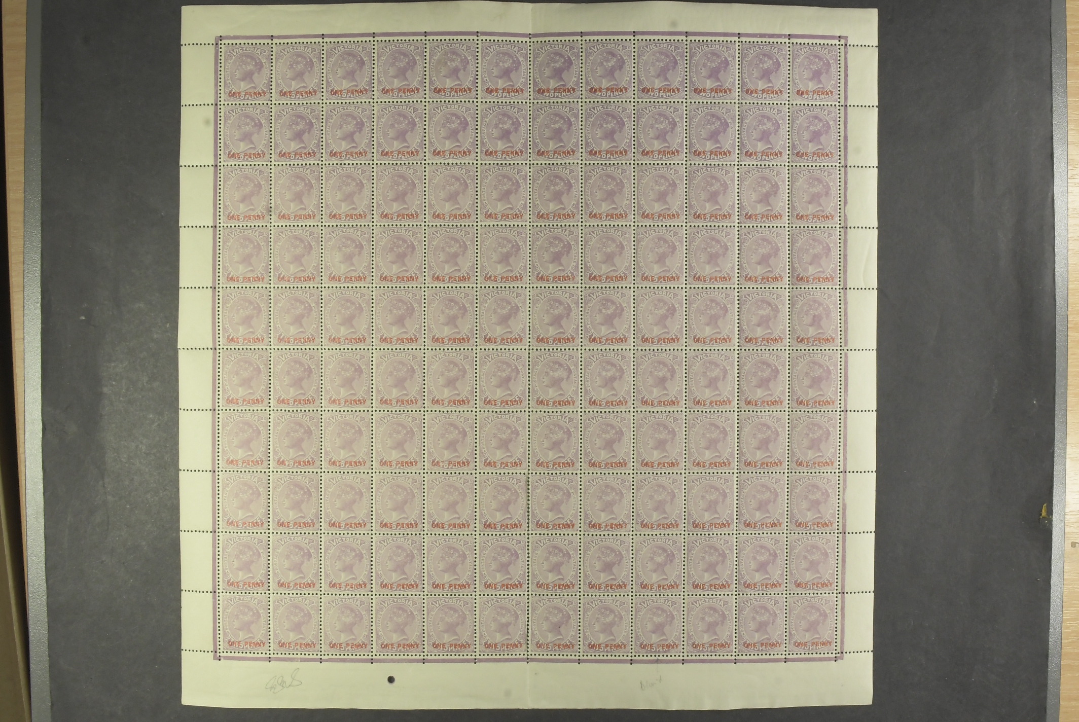 Australia, Victoria. SG 456 ★★, 1912 1 penny red overprint on 2 pence complete sheet of 120 including broken letter varieties on overprint. Very attractive, inverted watermarked including the lettering in the side margins, a recent discovery.