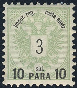 Austria, post in Levant. Michel 14 II ★, 1886 10 Pa on 3 sld green. EUR 250
