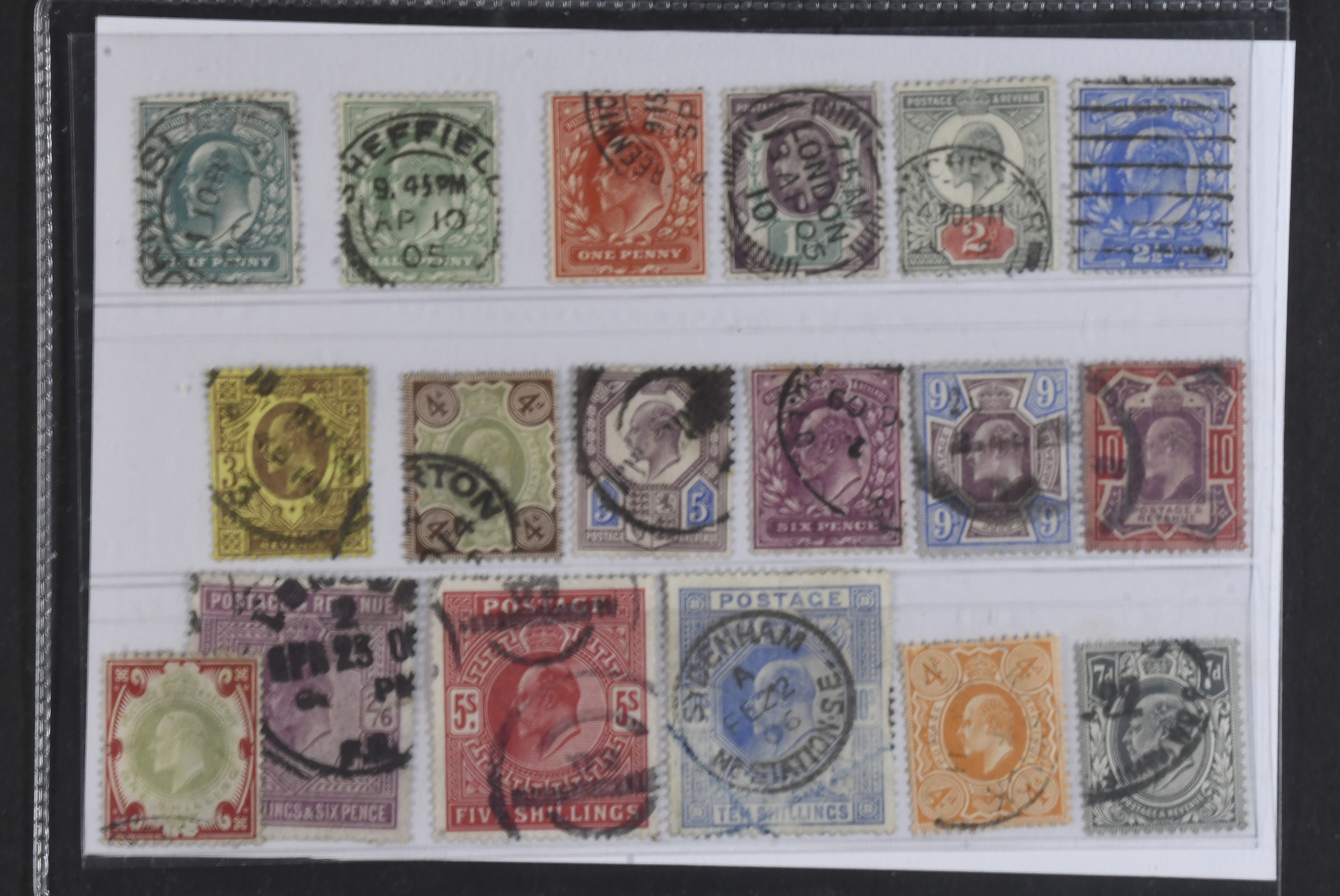 Britain. Michel 102–17, 119–20 used, 1902 King Edward VII short set up to 10s. 10s faded and with blue ink cross. EUR 650