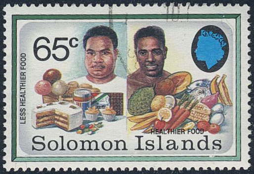 British Solomon Islands. Sc 693 note used, Unissued 65c healthy/unhealthy food used, Very scarce! USD 300 for **