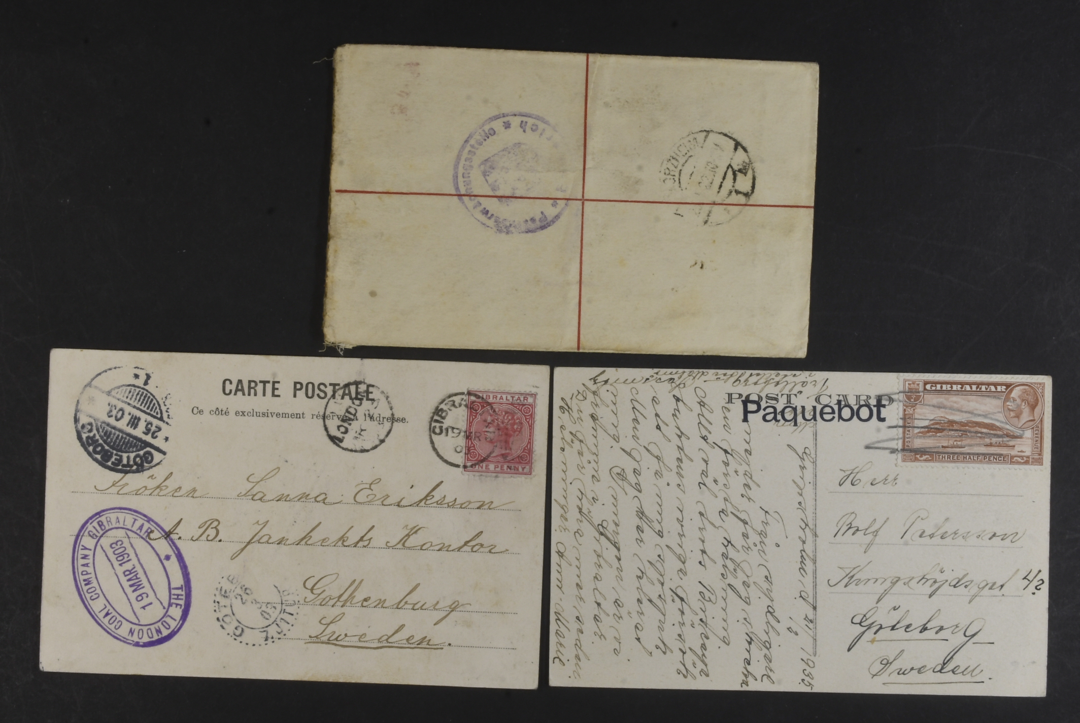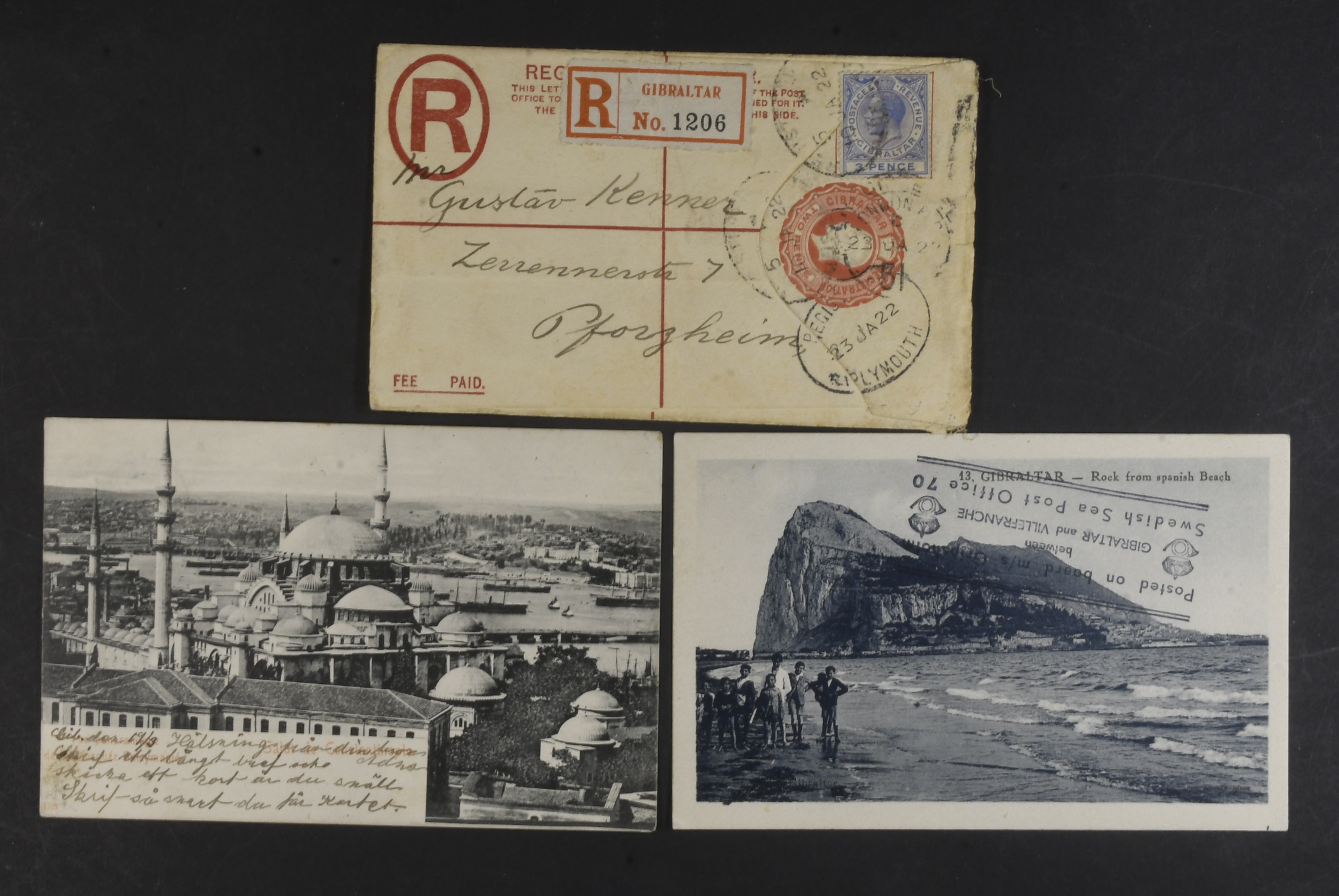 Gibraltar. Covers. Registered 2 d postal stationary also franked with 3 p sent to Germany 1922 via Plymouth. Also two postcards sent to Sweden 1903 and 1935 (paquebot).