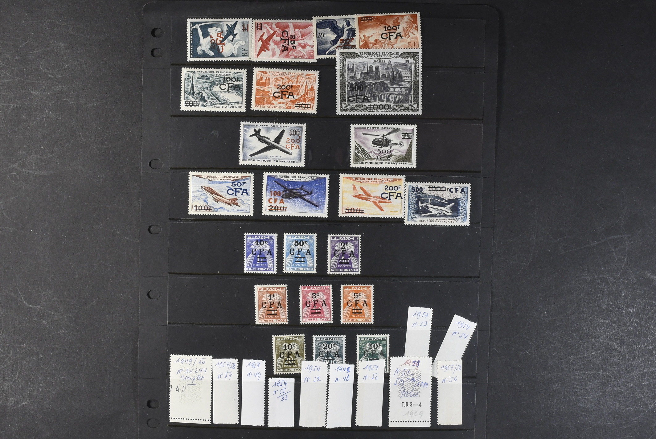 Réunion. ★★. Virtually all the good post WW2 airmails, MNH, complete sets, all with low printing numbers, including the 1000 fr black view of Paris, similarly the jet planes, etc. Also present, the postage dues complete, MNH, difficult material to find today in this condition.