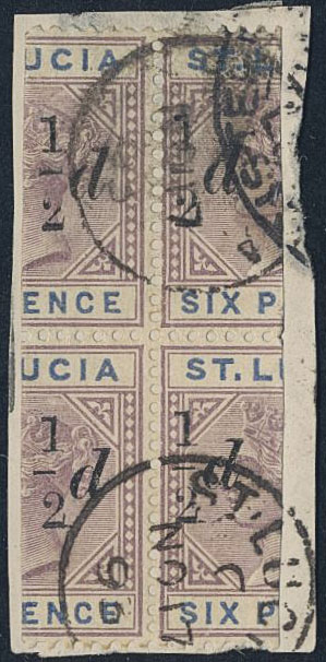 Saint Lucia. Michel 32 i used, 1991 New value overprint on Queen Victoria ½ d on half 6d dull mauve/blue die I wmk Crown CA. Beautiful block of four on paper cancelled St. Lucia Nov 17 1891. EUR 19