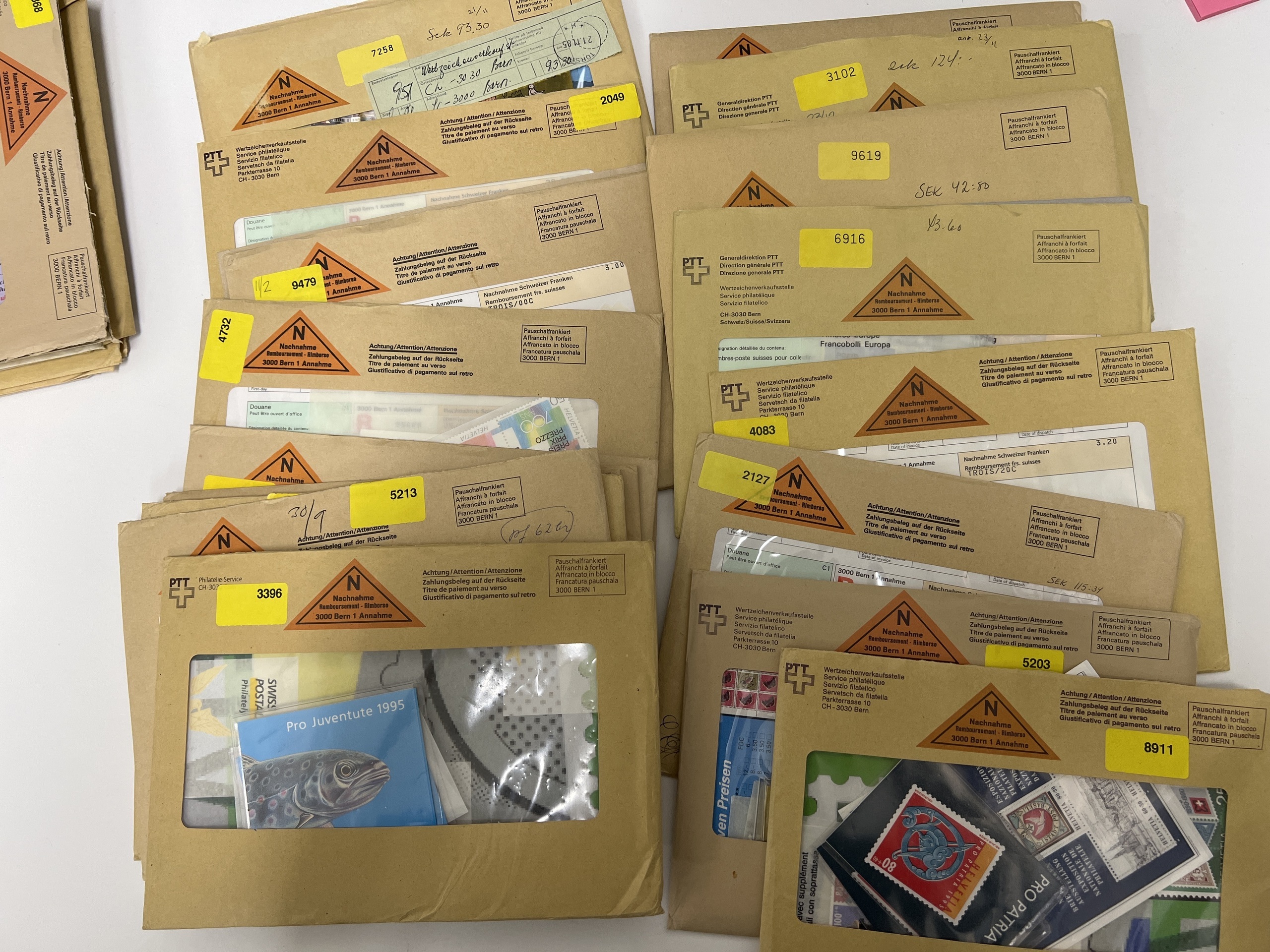 Switzerland. Face value, lot 1980–1990s in box. Subscription from Swiss post, from 1982–1996, not checked if complete. All in original envelopes. Total cost for subscriber 1190 CHF. Only mint face value, no FDC. However this amont is not franking value, due to several issuses of for instance Pro Juventute, etc. (100s)