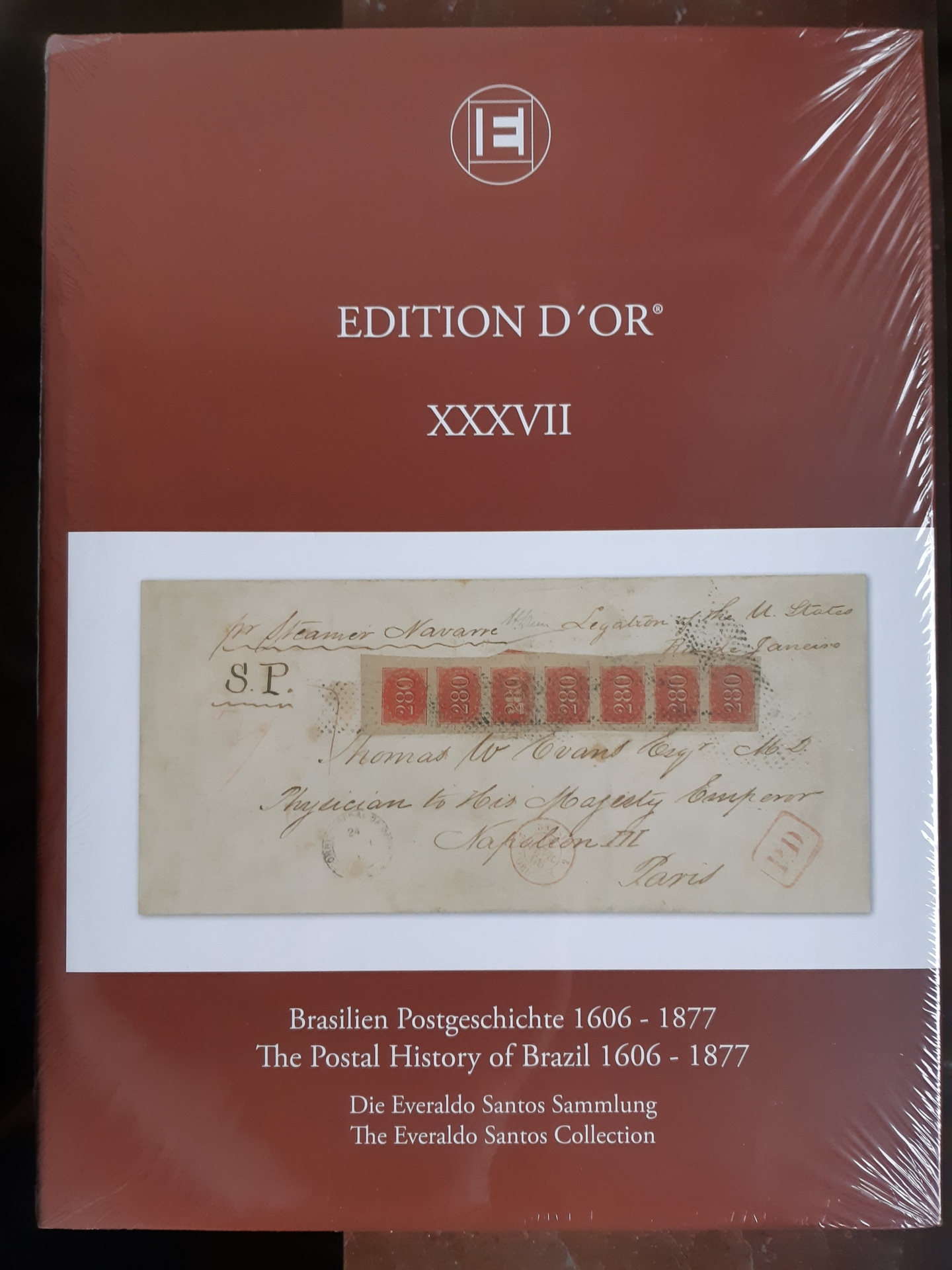 Literature. EDITION D'OR, Vol. XXXVII 'The Postal History of Brazil 1606–1877 – The Everaldo Santos Collection', The Global Philatelic Network, 2012. The Large Gold awarded exhibit depicted in its entirety, hardcover, with dust jacket, 136 pp., introduction bilingual English/German. New, still wrapped in plastic.
