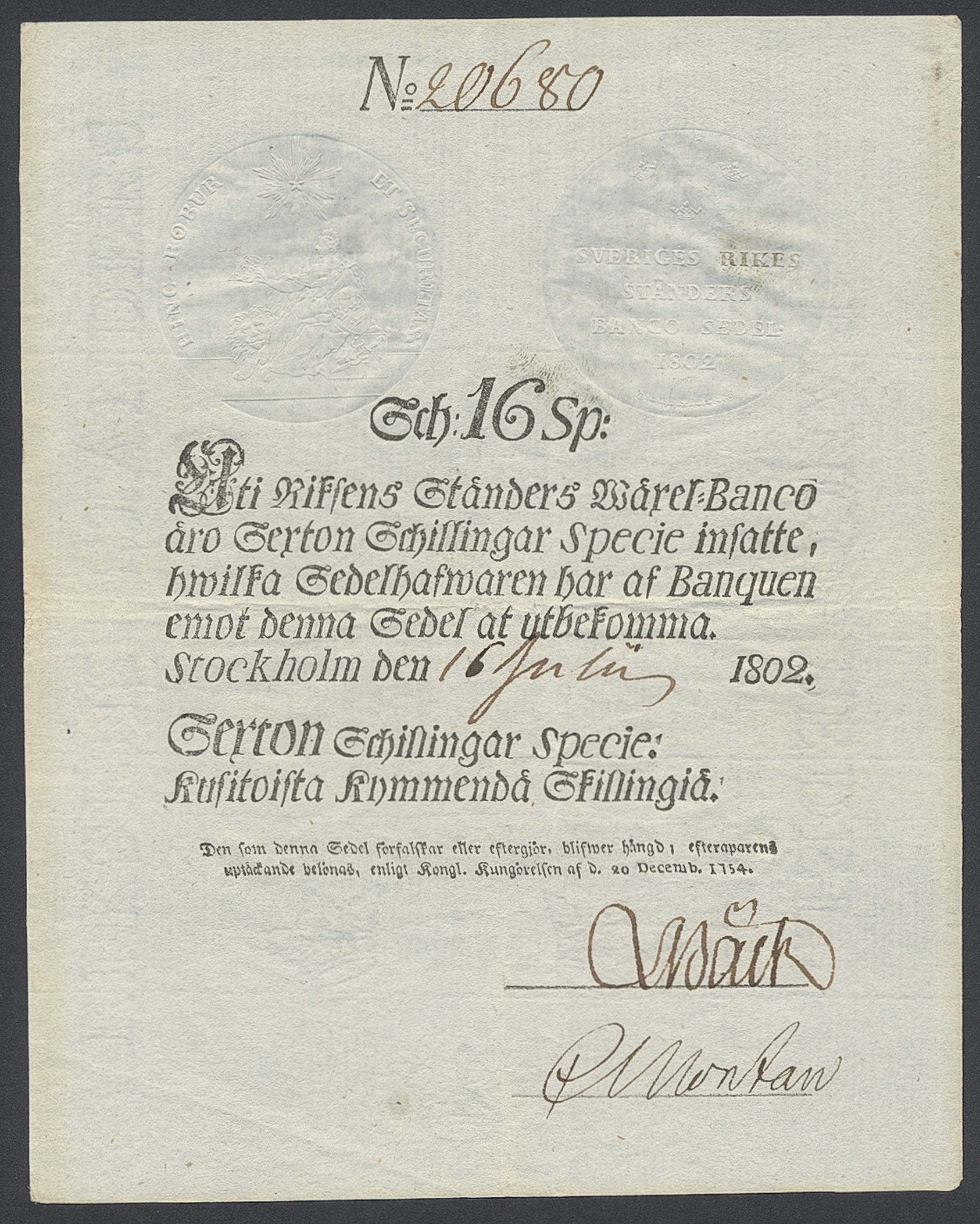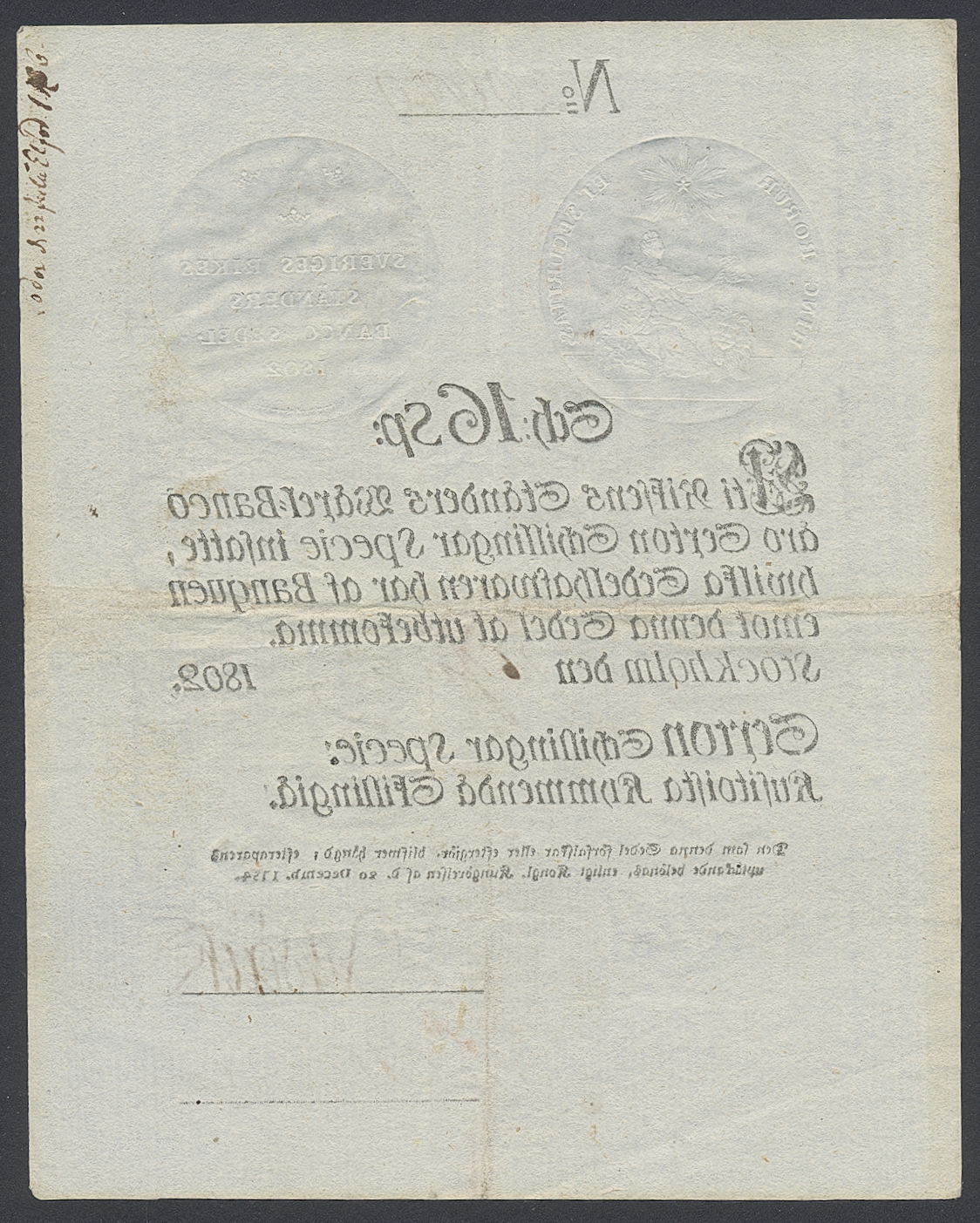 Banknotes, Sweden. DSS 240, 16 skillingar specie 1802. No 20680. Minor ink writing on reverse,. 1+.
