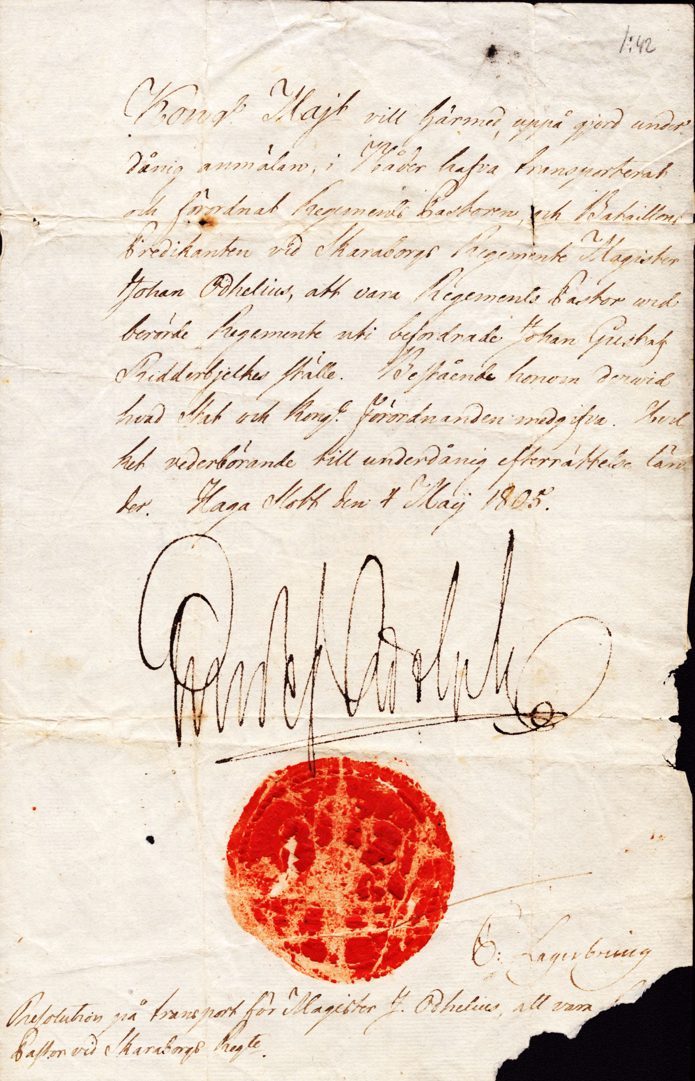 Autographs. Gustav IV Adolf (1778-1792-1809-1837). King of Sweden. Resolution dated Haga Palace May 4, 1805 and with the King's signature. Paper loss at the bottom. Transcription in Swedish enclosed.