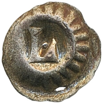Coins, Sweden. Magnus Eriksson, LL XXVIII:2c, 1 penning ND. 0.30 g. Lödöse. Bracteate with L within rayed circle, dot inside L. Small hole in planchet at edge. SMB 225. 1/1+.
