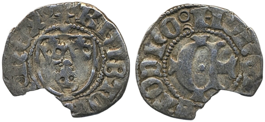 Coins, Sweden. Kristoffer av Bayern, LL 2c, 1 örtug ND. 0.91 g. Stockholm. Three crowns in shield on small cross, KRISTOFER REX)(HONETA STOCHOL, C legend starting at 12 o'clock. Major edge loss. RR. Rundberg 2d. SMB 329. 1+.