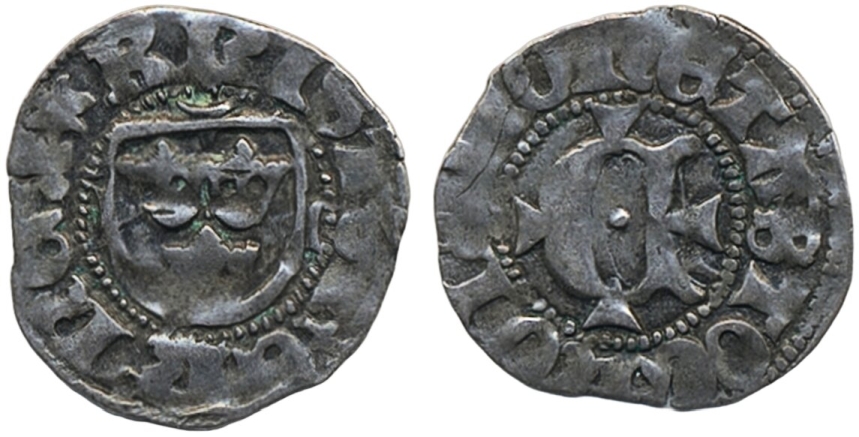 Coins, Sweden. Kristoffer av Bayern, LL 2c, 1 örtug ND. 0.85 g. Stockholm. Three crowns in shield on small cross, KRISTOFER REX)(HONETA STOCHOL, C legend starting at 9 o'clock. Rundberg 2f. SMB 331. 1/1+.