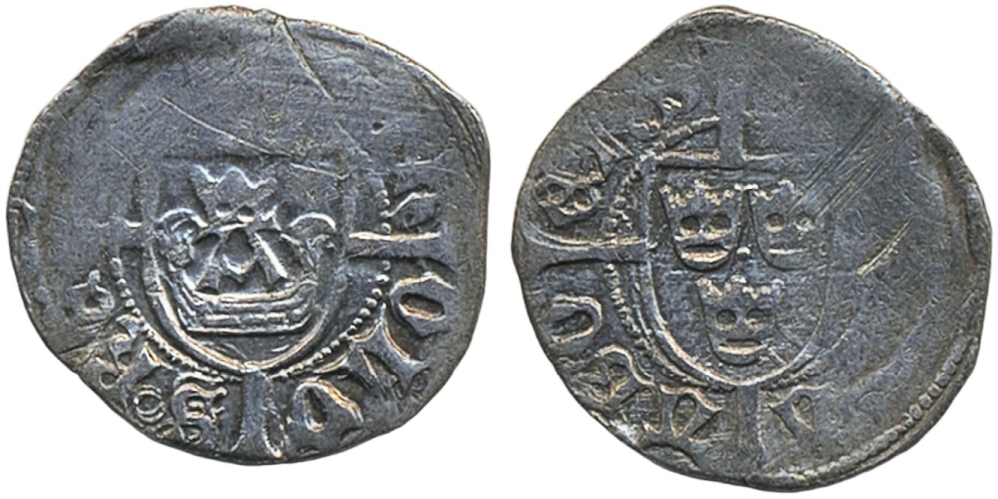 Coins, Sweden. Karl Knutsson Bonde, LL 6, 1 örtug ND. 1.37 g. Åbo. Bonde Coat-of-Arms with crowned A, KAROLVS REX S G)(HONETA ABOENS, Three crowns in rounded shield on large cross. Rings in legends on obverse. Partly weakly struck, scratches and cleaned. Rundberg 5b. SMB 351. 1/1+.