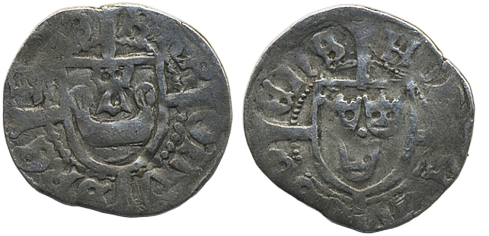 Coins, Sweden. Karl Knutsson Bonde, LL 6, 1 örtug ND. 1.15 g. Åbo. Bonde Coat-of-Arms with crowned A, KAROLVS REX S G)(HONETA ABOENS, Three crowns in rounded shield on large cross. No rings in legends. Rundberg 5c. SMB 352. 1/1+.