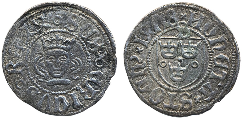 Coins, Sweden. Sten Sture den äldre, LL 2a, 1 örtug 1478. 1.23 g. Stockholm. Minor corrosion. 1/1+.