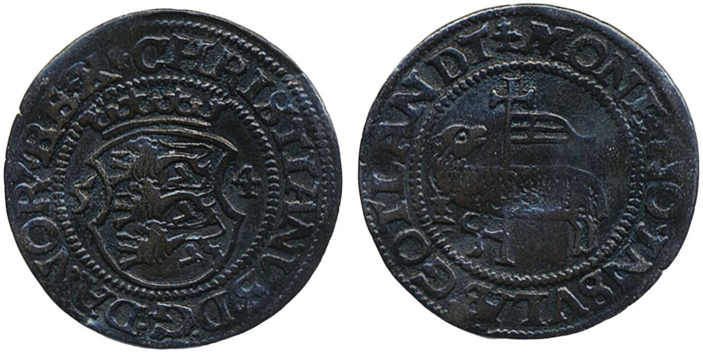 Coins, Sweden. Medeltid - Gotland, SMB 88, 1 skilling 1554. 1.26 g. Copenhagen. Hede 11. 1/1+.