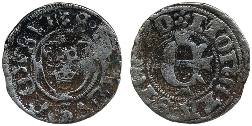 Coins, Sweden. Gustav Vasa, SM 62, 1 örtug ND. 1.21 g. Stockholm. Three crowns in shield on short cross, S ERICVS REX)(Unical E on short cross, MONETA STOCHO. Light corrosion. SMB 202. 1.