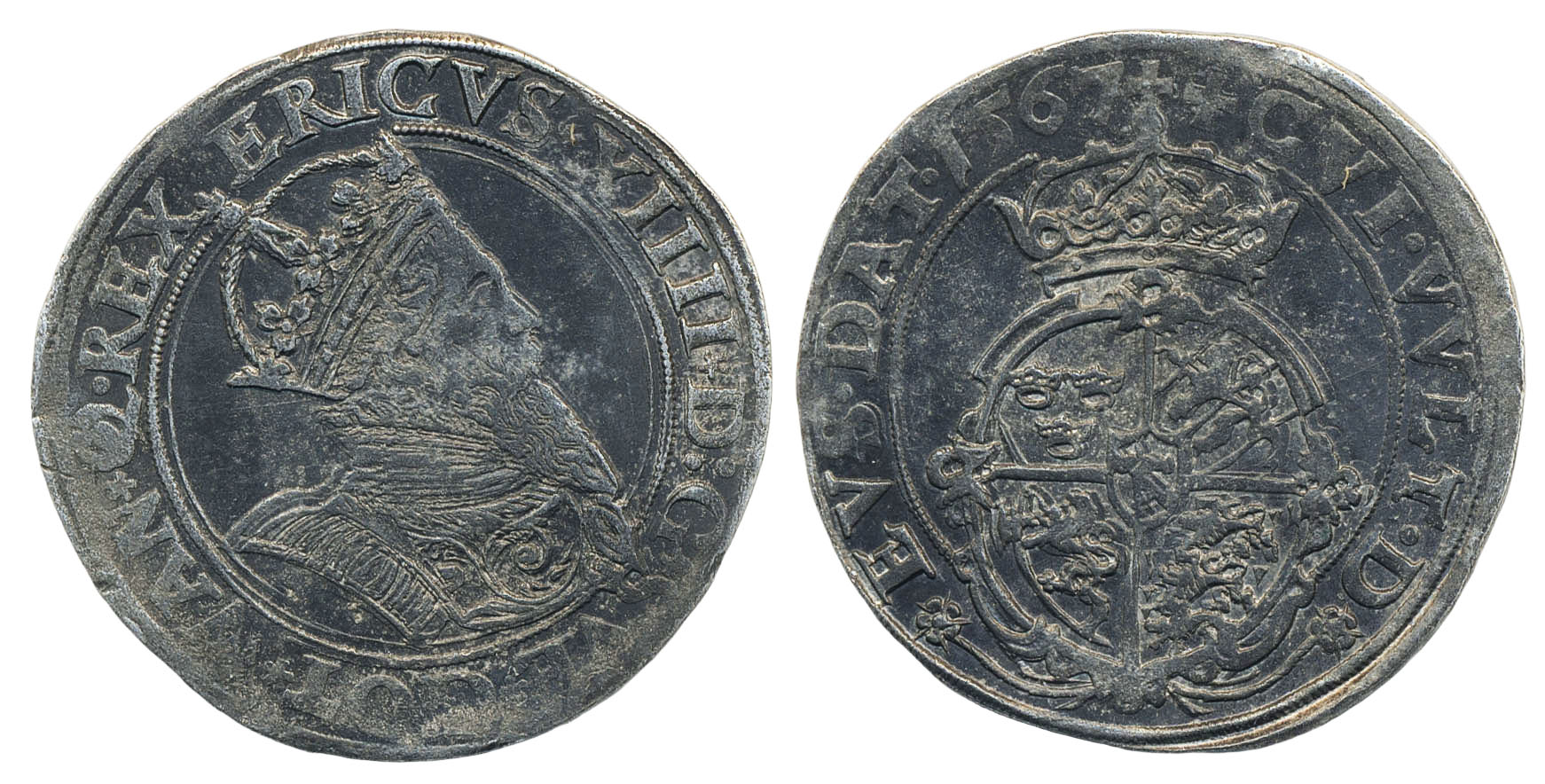 Coins, Sweden. Erik XIV, SM 27, 1 mark 1567. 11.14 g. Stockholm. Dark, lightly patchy patina. Well struck and hints of lustre. 1+/01.