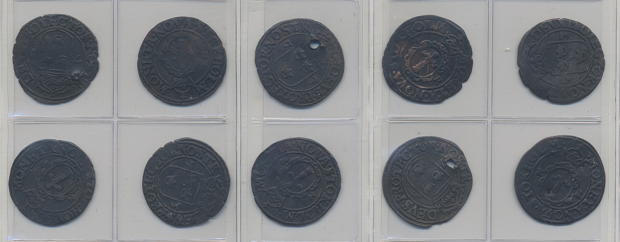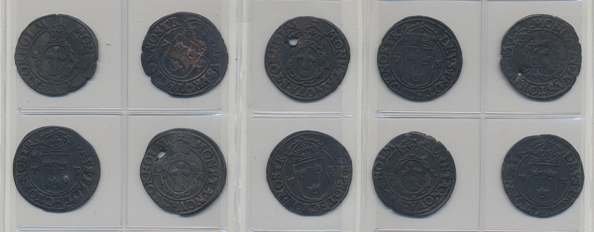 Coins, Sweden. Johan III, SM 75b, 2 öre 1573. Lot with ten examples in mixed condition (including three pierced). Please inspect! 1?-1+.