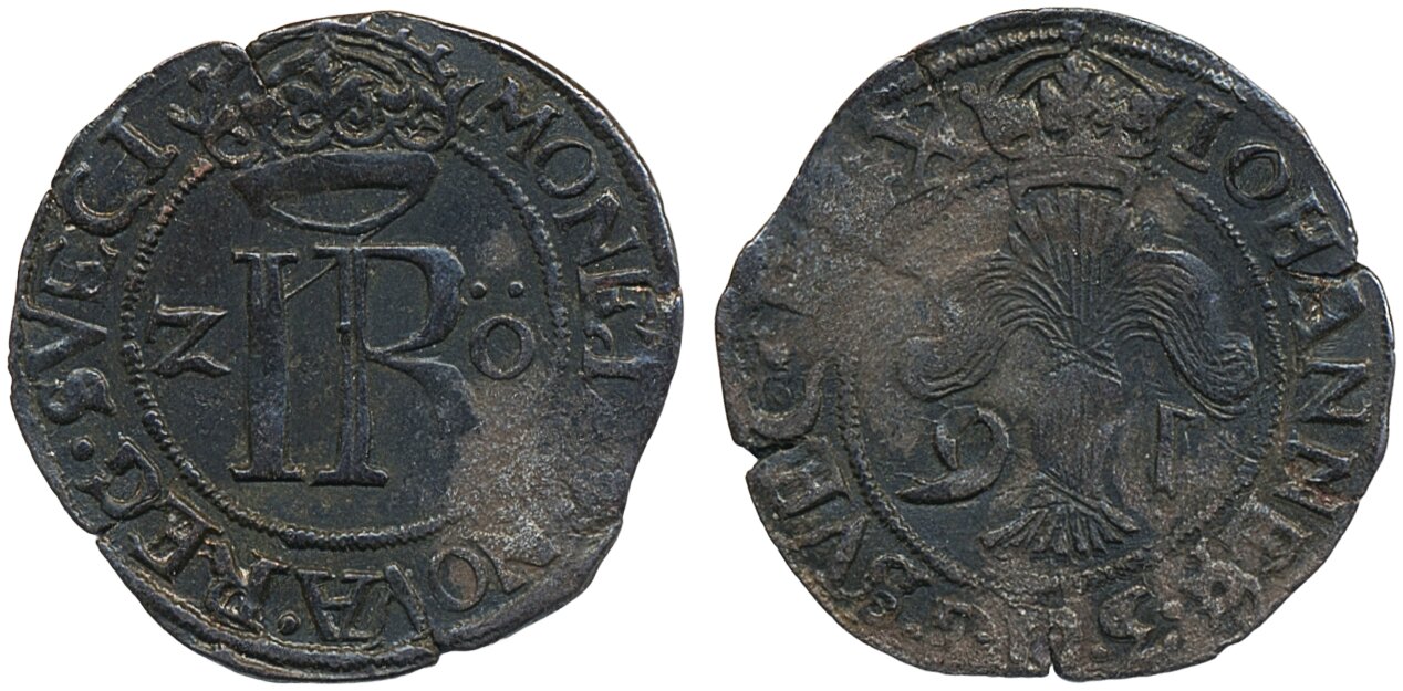 Coins, Sweden. Johan III, SM 78, 2 öre 1591. 2.15 g. Stockholm. Small planchet cracks. Obv SVEC, rev SVECI. 1+.