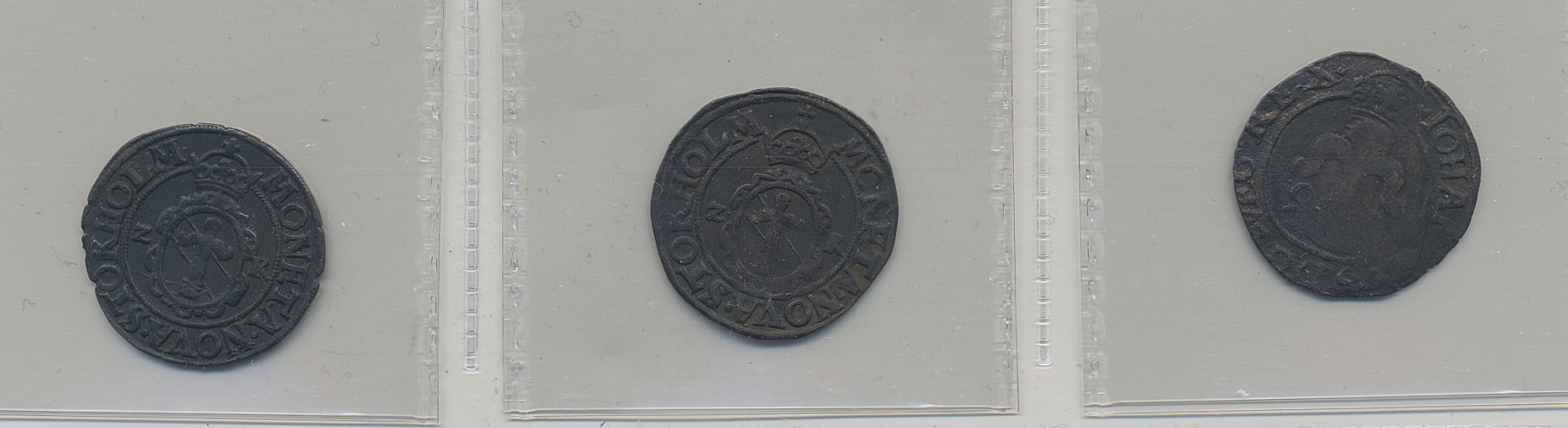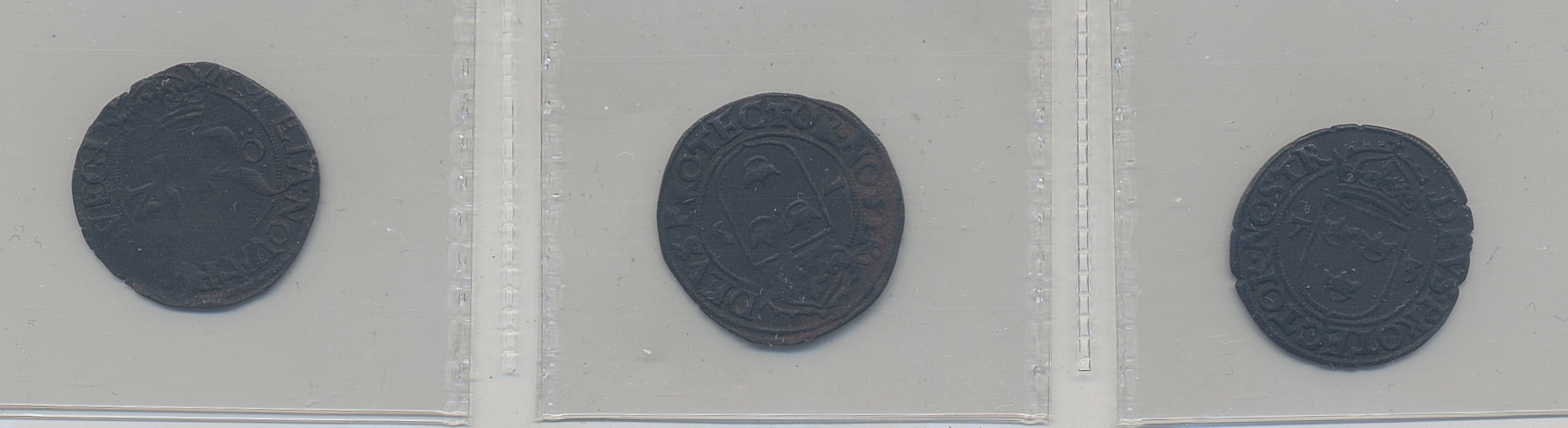 Coins, Sweden. Johan III, 2 öre. Three bronze coins, 2 öre 1573 ZR, 2 öre 1573 ZR and 2 öre 1592, mixed quality.