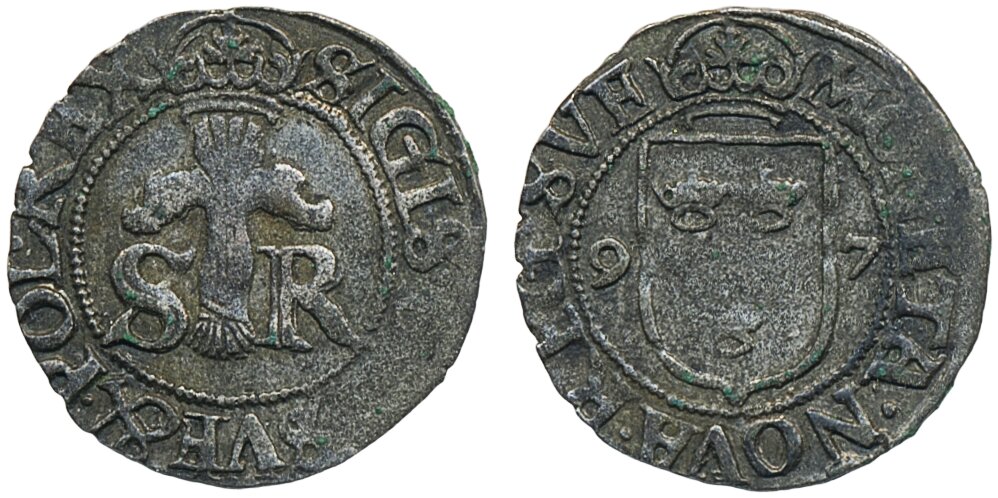 Coins, Sweden. Sigismund, SM 23a, ½ öre 1597. 1.73 g. Stockholm. 1+.