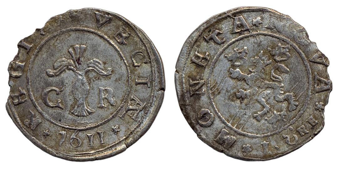 Coins, Sweden. Karl IX, SM 77a, 1 öre 1611. 1.41 g. Stockholm. Somewhat irregular planchet. 1+/01.