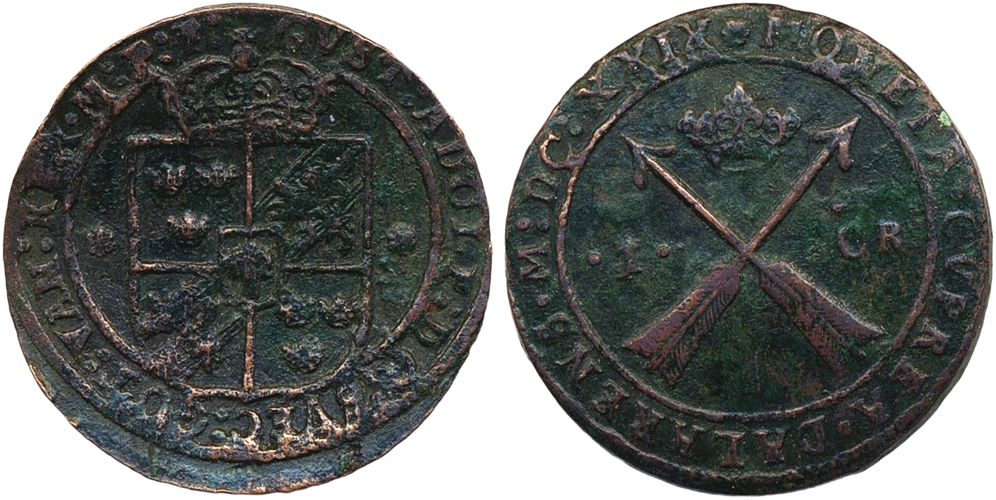 Coins, Sweden. Gustav II Adolf, SM 168a, 1 öre 1629. 28.85. Säter. Lightly cleaned, verdigris. SMB 223. 1+.