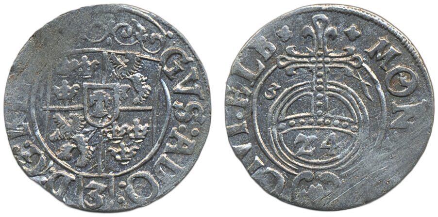 Coins, Swedish possessions, Elbing. Gustav II Adolf, SB 25, 1/24 taler 1631. 0.92 g. Date with reversed 1, scarce variety. Somewhat weakly struck. 01.
