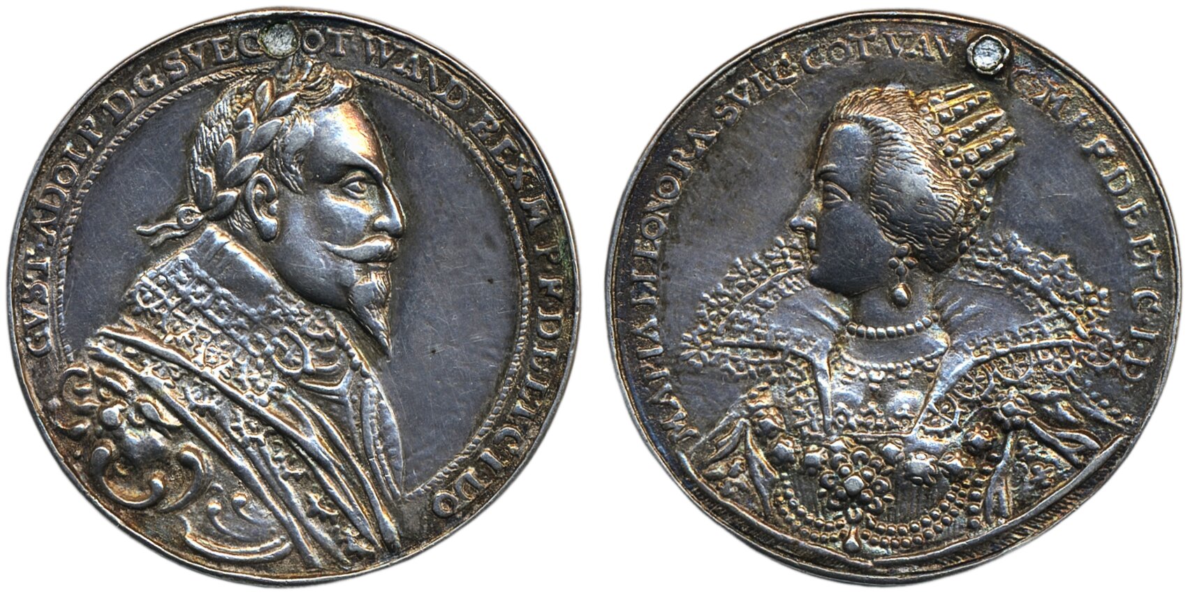 Medals, regal, Sweden. Gustav II Adolf, Hild. 304, Silver medal depicting Gustavus Adolphus and Maria Eleonora, 9.42 g. 35 mm. Plugged, tooled. 01.