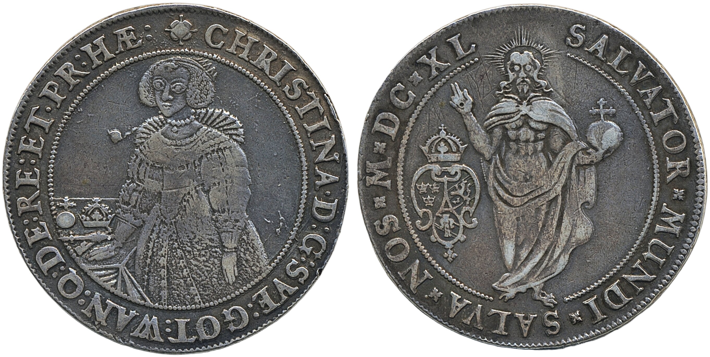 Coins, Sweden. Kristina, SM 11, 1 riksdaler 1640. 27.82 g. Sala. Graffiti on reverse, scrubbed. 1.