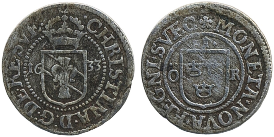 Coins, Sweden. Kristina, SM 84a, 1 öre 1633. 1.08 g. Stockholm. 1/1+.