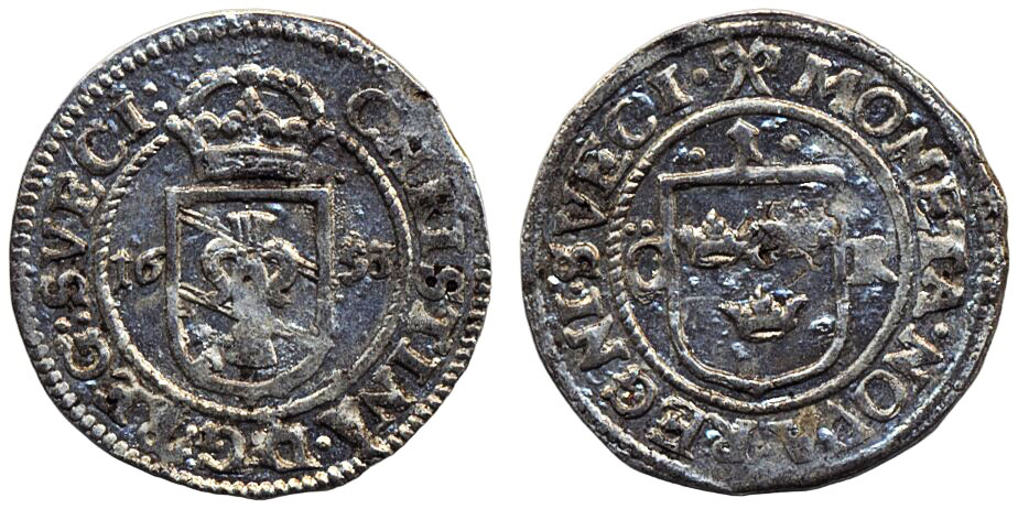 Coins, Sweden. Kristina, SM 90a, 1 öre 1653. 1.10 g. Stockholm. Lustrous, some bubbles in surfaces. 1+.