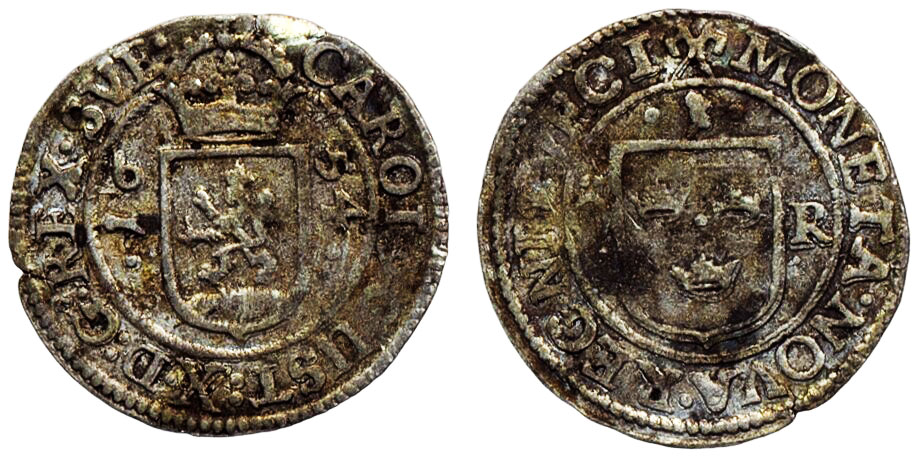 Coins, Sweden. Karl X Gustav, SM 27a, 1 öre 1654. 0.95 g. Stockholm. Thin scratch on reverse, minor planchet crack. 1/1+.