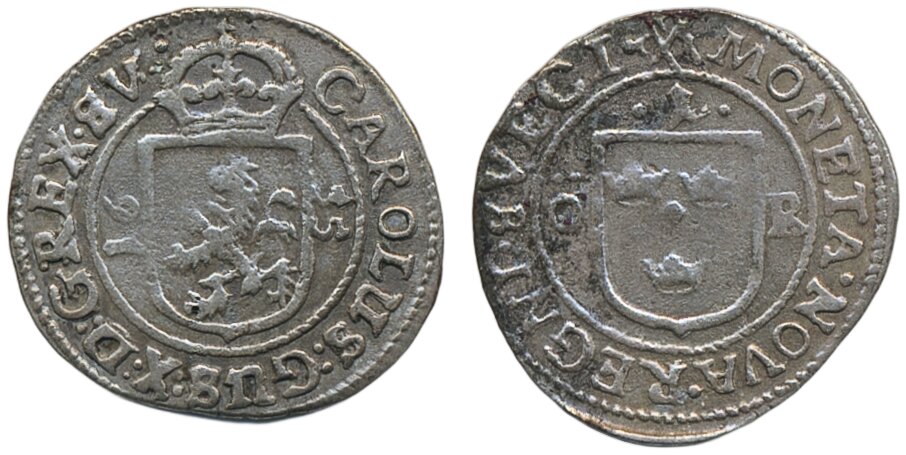 Coins, Sweden. Karl X Gustav, SM 29, 1 öre 1655. 1.32 g. Stockholm. 1/1+.