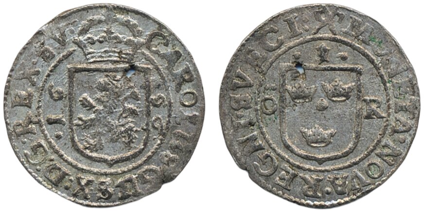 Coins, Sweden. Karl X Gustav, SM 30, 1 öre 1656. 1.29 g. Stockholm. Lustrous and attractive example. Minor hole in centre of planchet from production. Ex. Bonde 1 lot 423. 01.