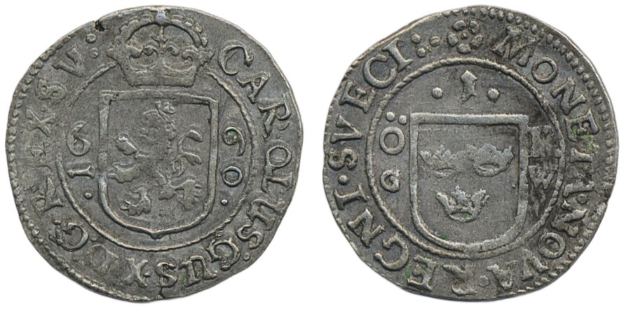 Coins, Sweden. Karl X Gustav, SM 33, 1 öre 1660. 1.42 g. Stockholm. 1+.